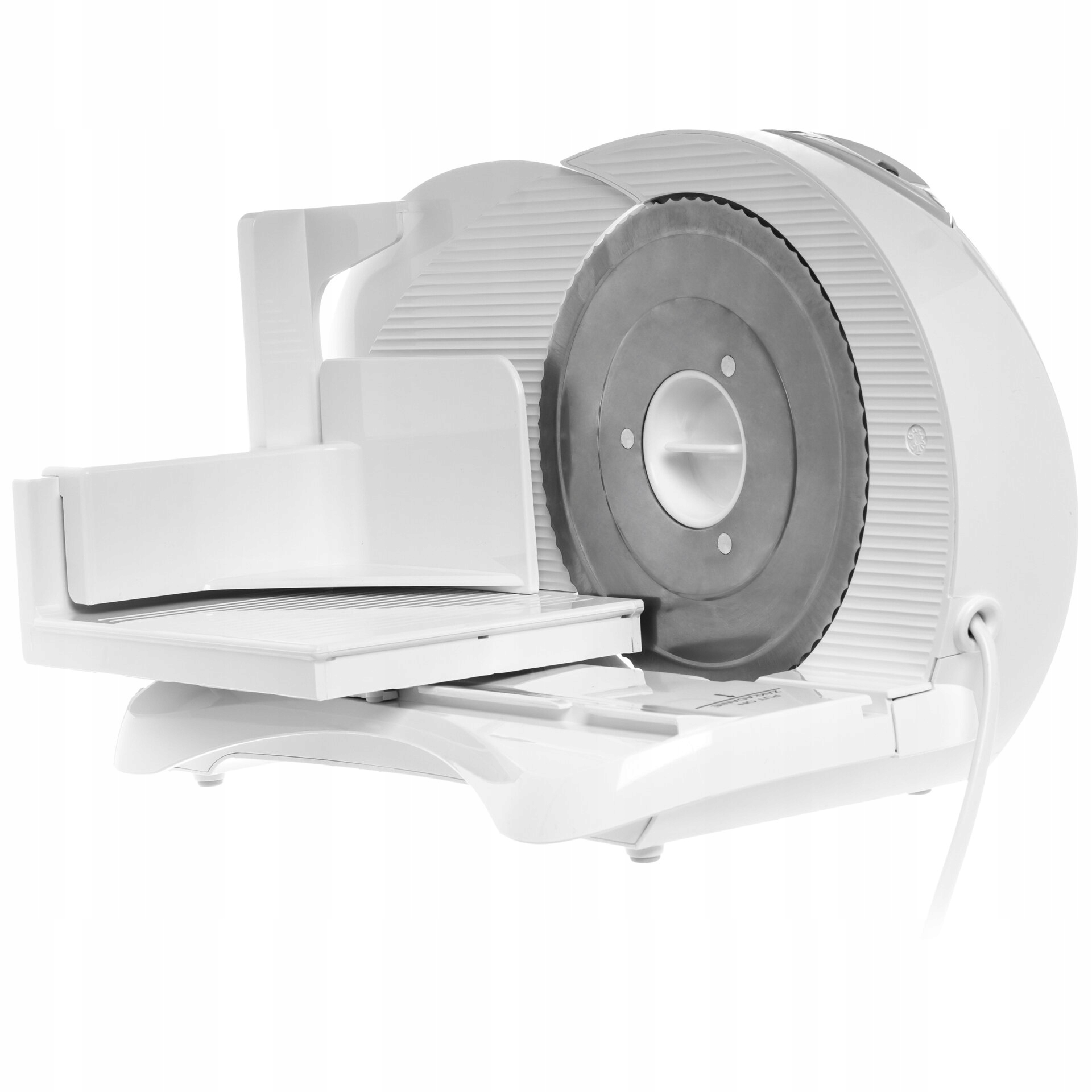 Слайсер має ергономічний перемикач і плавне регулювання товщини нарізки - 1-15 мм. Пристрій захищений від випадкового зняття коляски та активації дітьми. Завдяки протиковзким ніжкам він не ковзає по стільниці. Міцний, надійний на кожній кухні. Слайсер дуже легко підтримувати в чистоті. Він точно пасуватиме як до традиційної, так і до сучасної кухні.