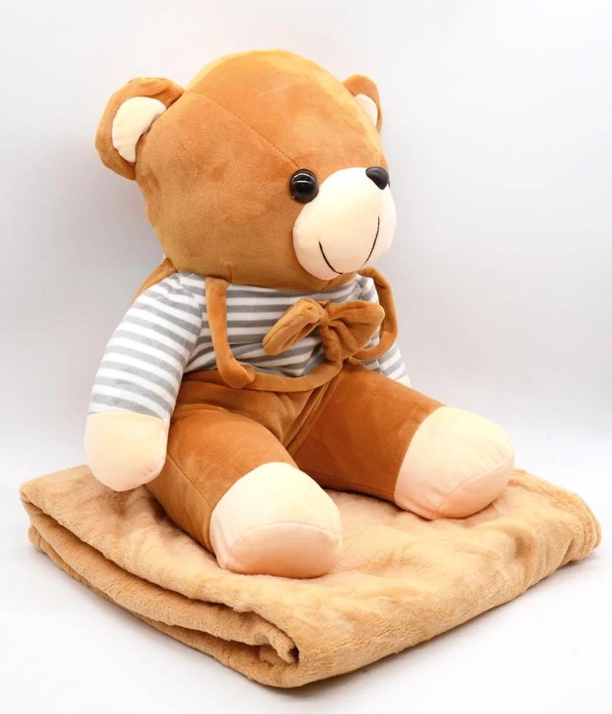 Чарівний плюшевий ведмедик у формі ВЕДМЕДИКА за яким ховається гарна та затишна ковдра розміром 100х160 см. Набір дуже гарно виготовлений, в яскравих кольорах.