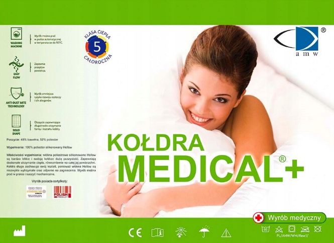 Основою лікування алергічних захворювань є уникнення алергенів, тобто факторів, що викликають алергію. Доведено, що основний алерген людини, кліщі домашнього пилу, не розмножуються на поліестеровій основі, тому ковдра Medical®+ з таким складом є бар'єрним матеріалом проти цього алергену. Продукт можна використовувати як допоміжний засіб*⁾ для профілактики та полегшення наступних алергічних захворювань**), як один із елементів різноспрямованої дії, спрямованої на обмеження впливу алергенів: хронічний алергічний риніт, бронхіальна астма, атопічний дерматит, інші алергічні захворювання (наприклад, кон'юнктивіт, синусит, гортані, глотки та піднебінних мигдалин).