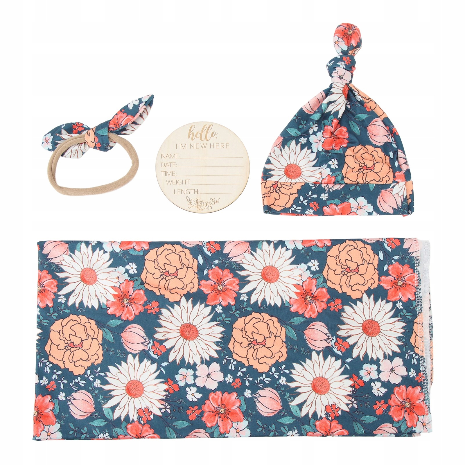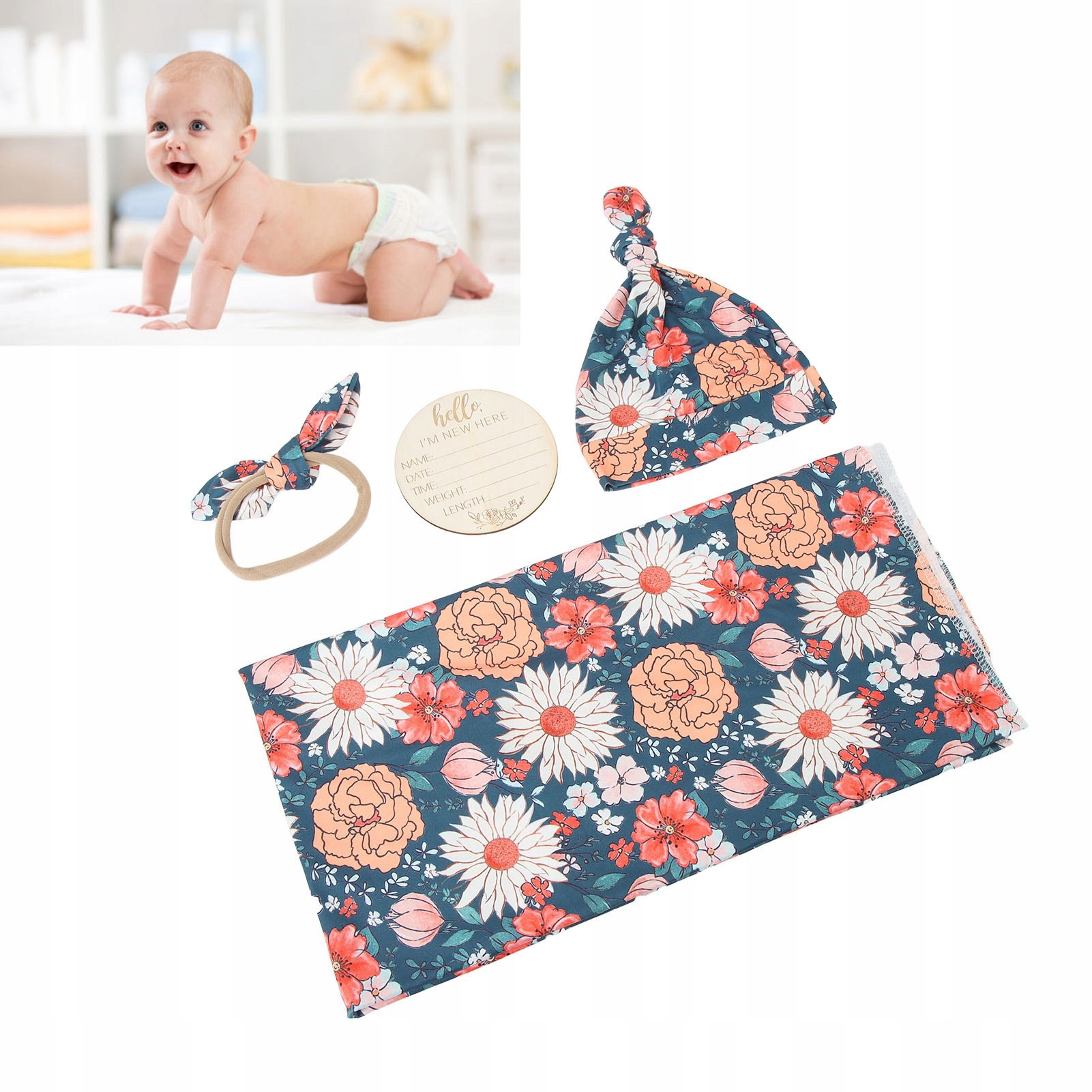 4. НАБІР З ЧОТИРЕХ ЧАСТИН: набір для сповивання новонародженого з квітковим принтом включає сповивання, шапочку, гумку для волосся та шарм на місяць для різних потреб.