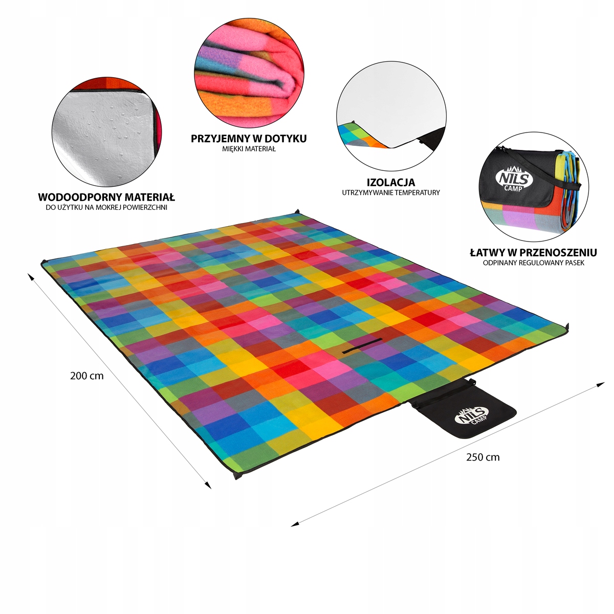 Це ковдра з настільки великою поверхнею (250x200), що на ній без проблем може розміститися вся родина. Це рішення набагато ефективніше, ніж дві менші ковдри. Немає ризику, що ковдри посунуть і хтось із наших речей впаде на траву або, що ще гірше, на пісок.