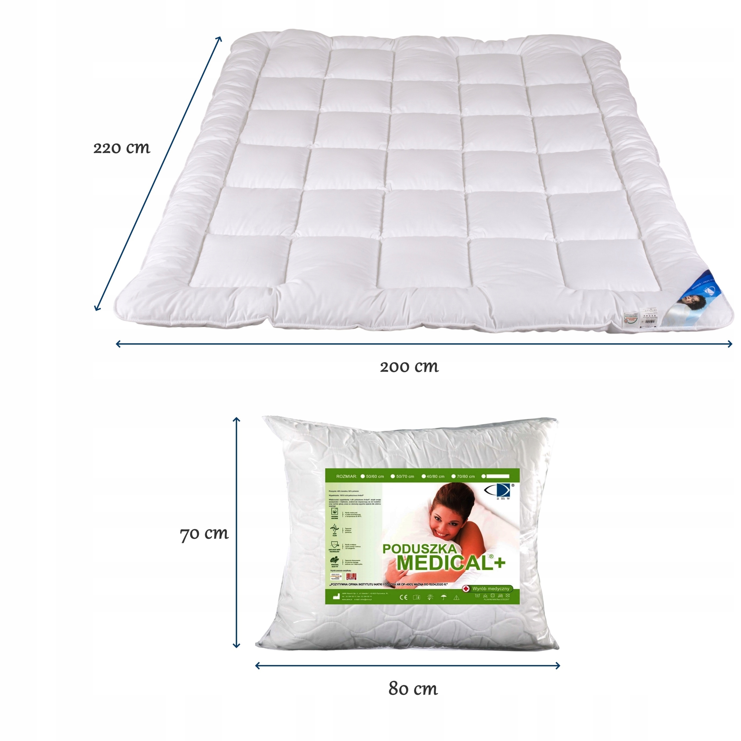 Ковдра та подушки MEDICAL від польської компанії AMW складаються з 48% бавовни та 52% поліестеру. Завдяки цьому вони гарантують неймовірну довговічність, не подразнюють шкіру та настійно рекомендуються для алергіків.