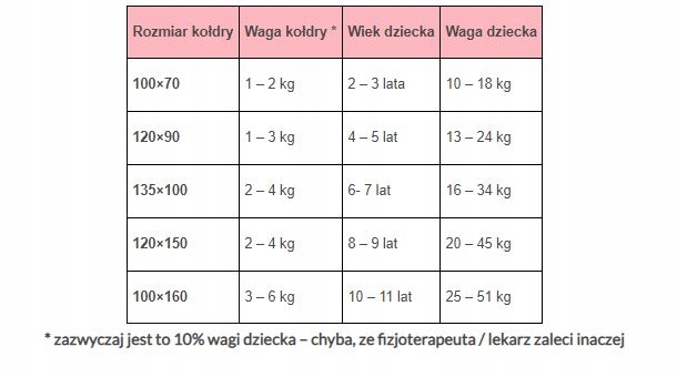 ✅ Якщо ваш лікар або фізіотерапевт не радить інше, вага ковдри з обтяжувачами має становити 10% від ваги вашої дитини. Для ковдри 100х160 зазвичай це 3-6 кг. Ми регулюємо вагу ковдри відповідно до вашої дитини.