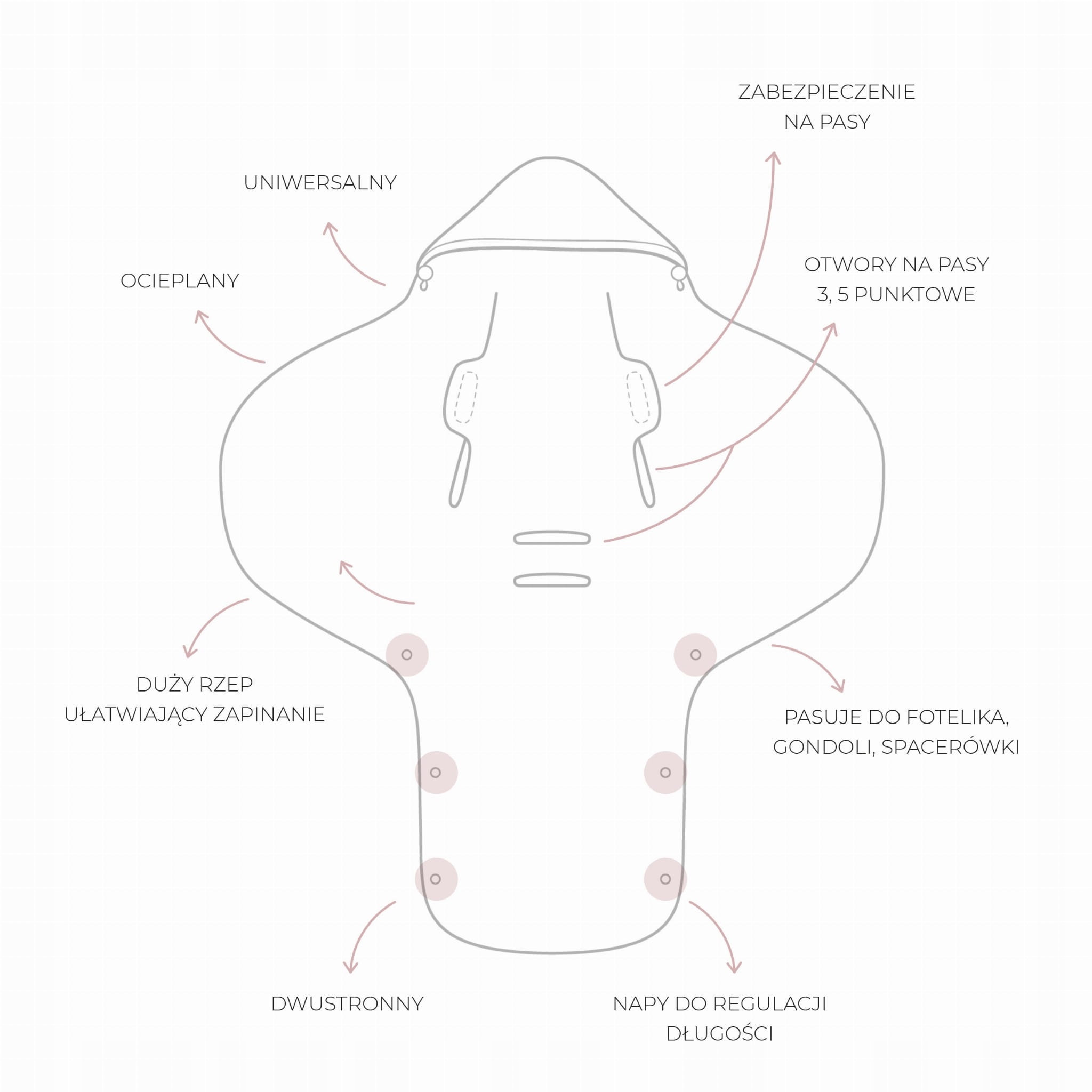 Ковдра підходить для 3-х і 5-точкових ременів безпеки. Універсальний розмір дозволить використовувати цей виріб з першого дня життя приблизно до 12 місяців.