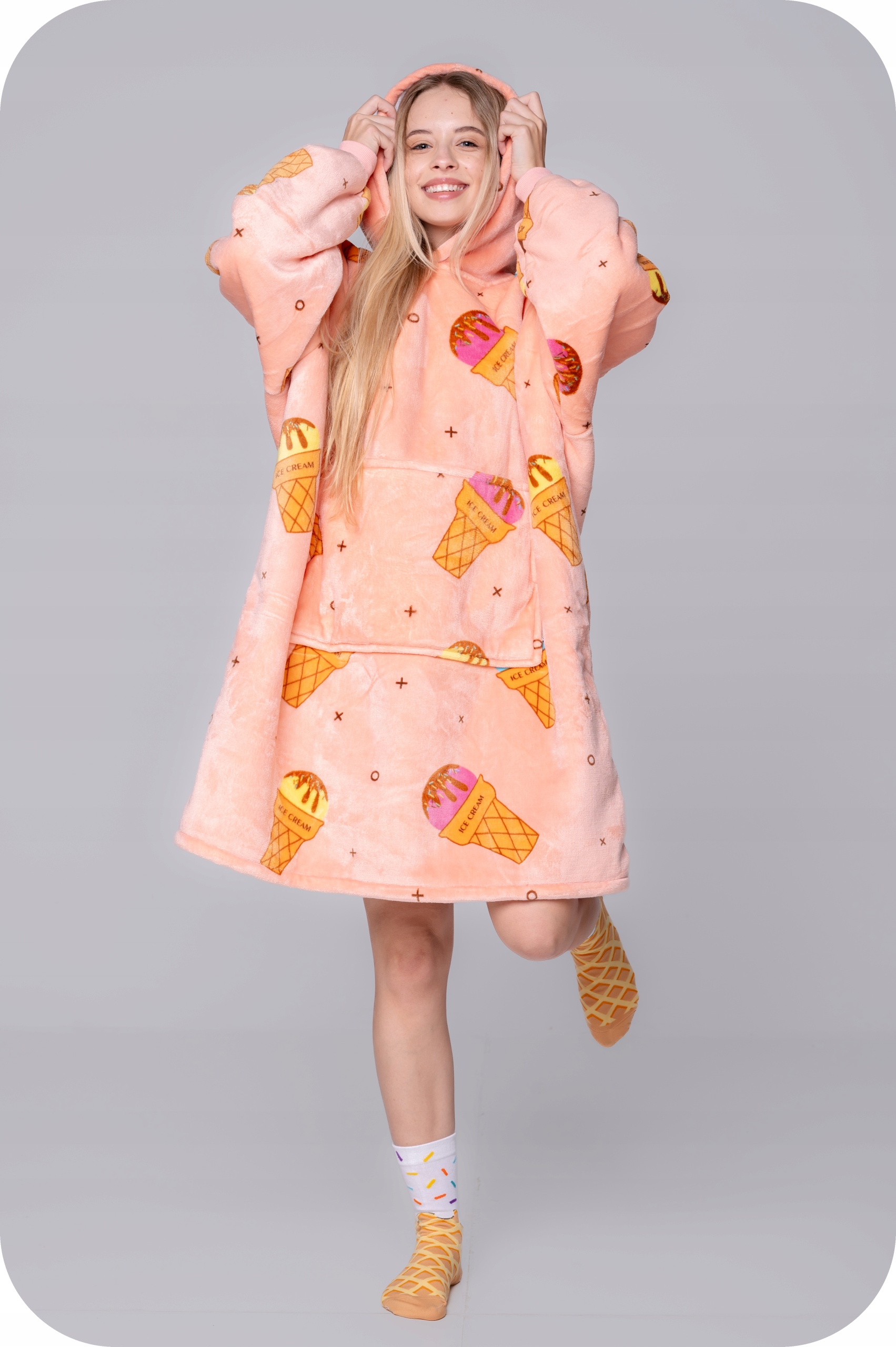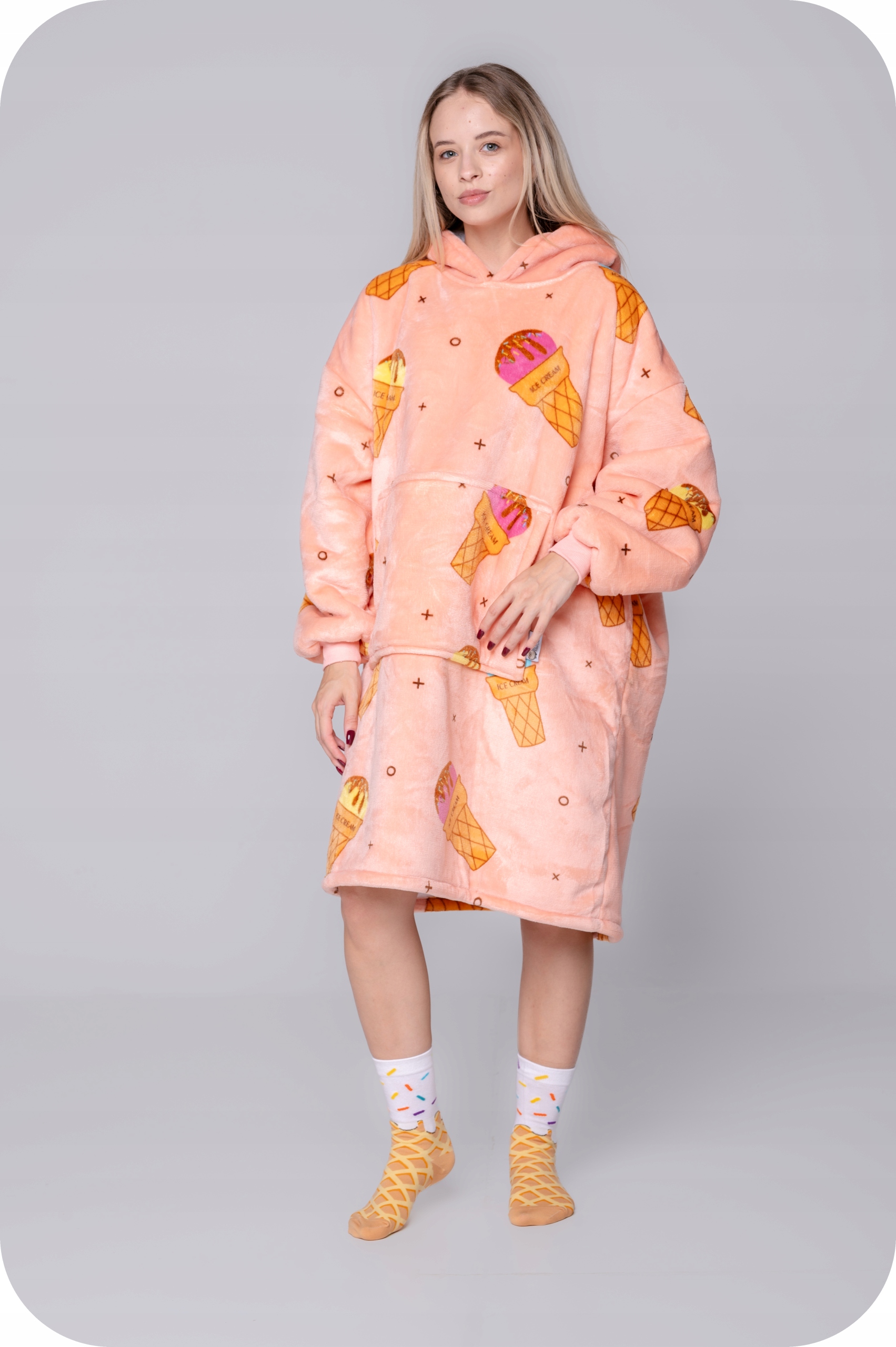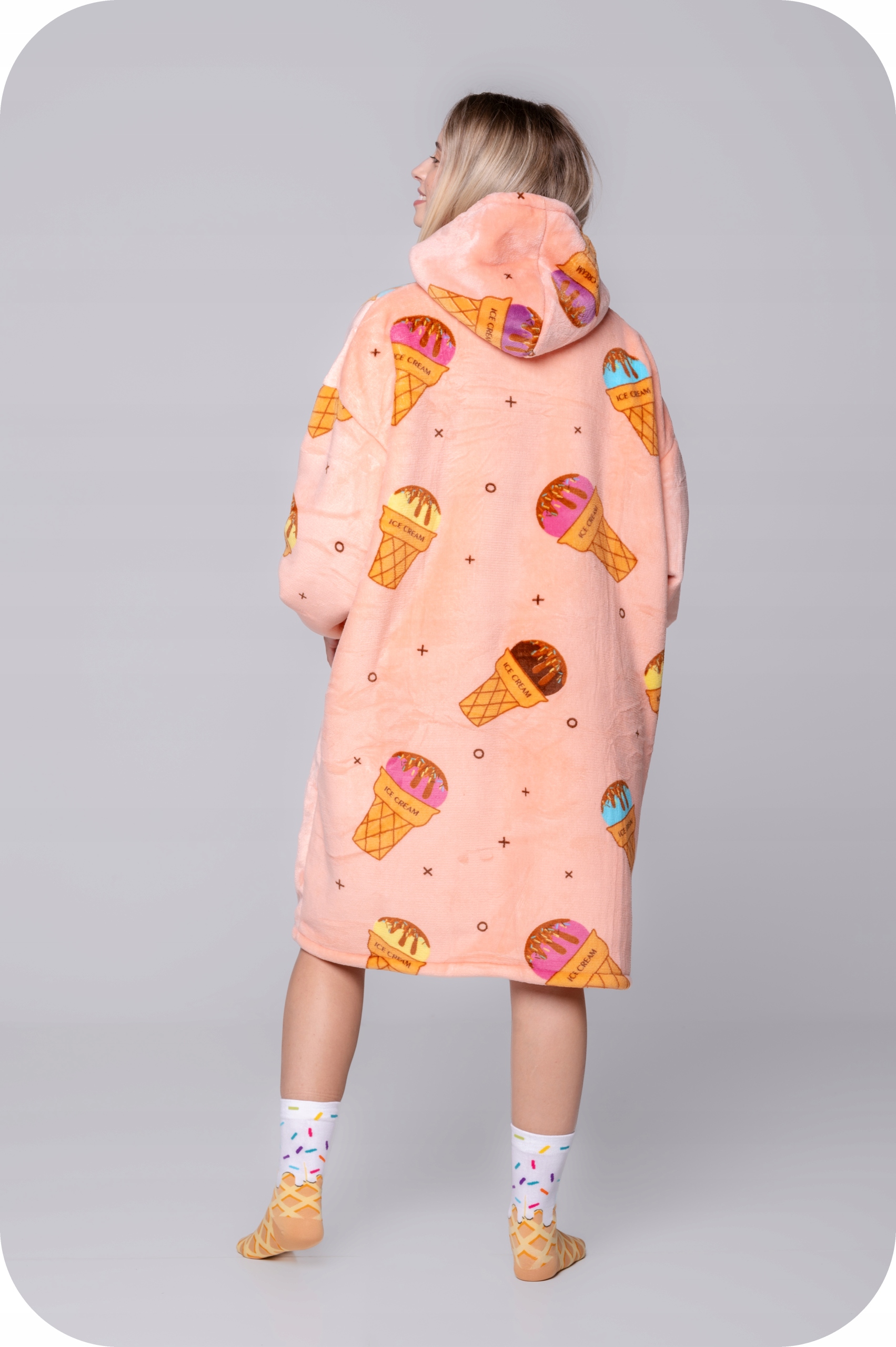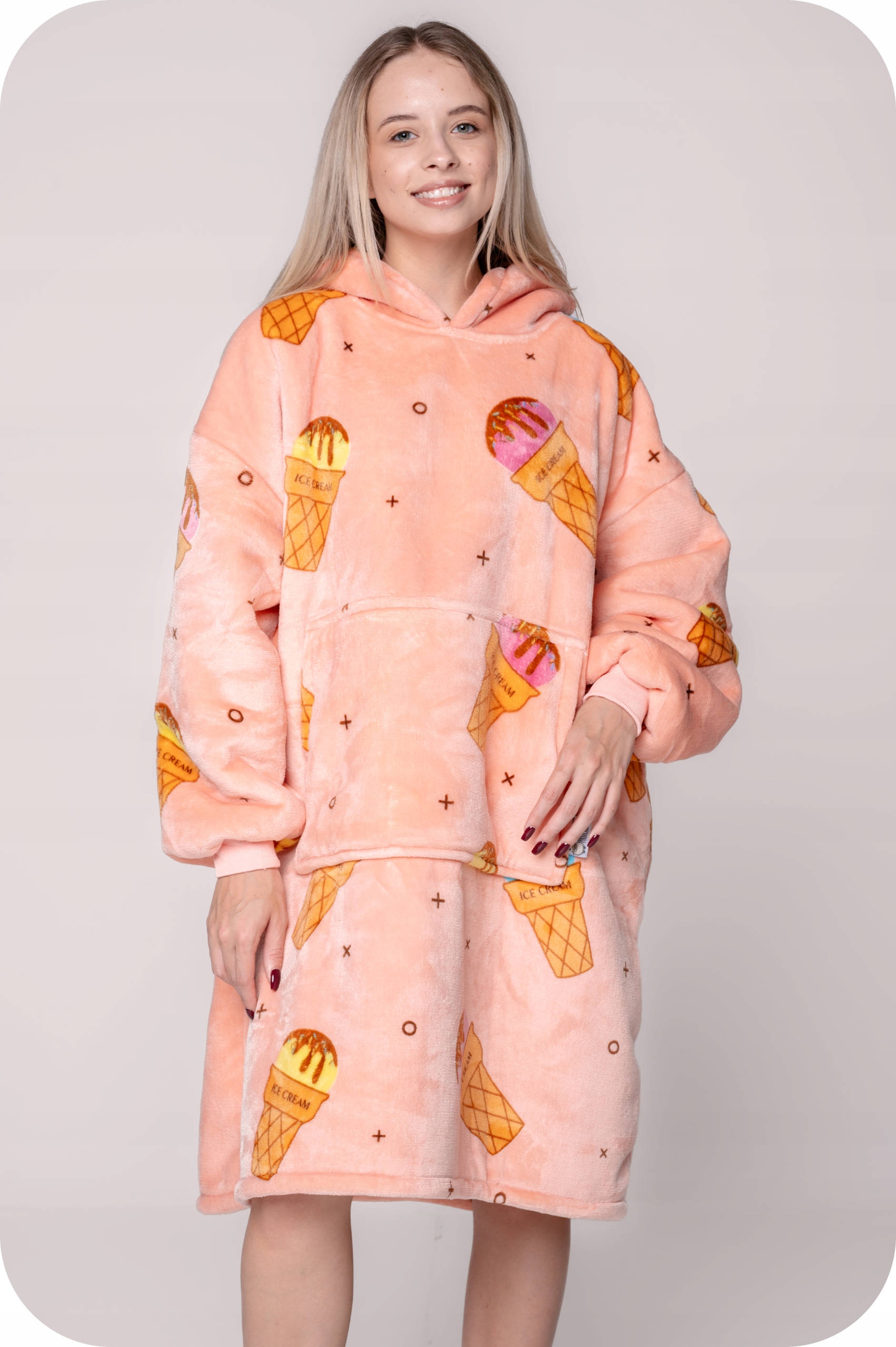 Він функціонує і як світшот, і як ковдра. Спереду є велика кишеня, яка не тільки зігріє руки, але й дозволить зберігати такі речі, як телефон, пульт дистанційного керування, книгу та багато іншого. Великий капюшон може служити подушкою, наприклад, під час подорожі, читання книги на дивані або перегляду улюбленого серіалу.