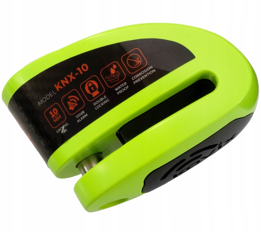 Блокатор гальмівного диска з вбудованою сигналізацією з інтенсивністю звуку 120 дБ з можливістю налаштування опції ON/OFF сирени. Замок з нержавіючої сталі та водонепроникні електричні компоненти гарантують захист від корозії та надійність за будь-яких погодних умов. Замок оснащений довговічною та екологічно чистою літієвою батареєю. Захист фіксує колесо за допомогою штифта діаметром 10 мм, що запобігає руху та переміщенню мотоцикла чи скутера.