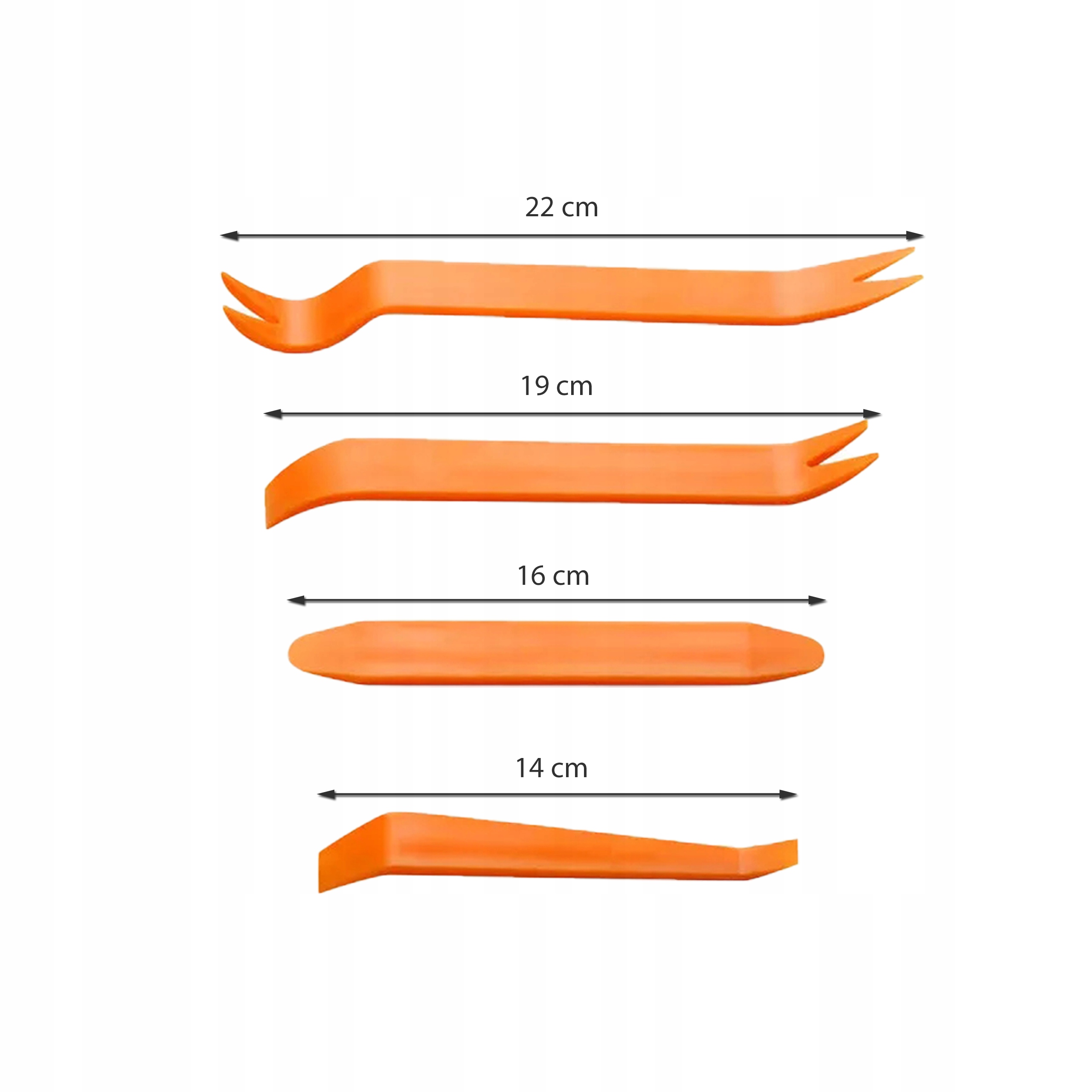 Набір з 11 знімачів різної довжини та форми + ломик 30 см для безпечного зняття оббивки, автомобільних молдингів, накладки на двері та ін. Особливо рекомендується для роботи в автомобілях, кузовних роботах, фарбуванні та ремонті автомобілів.