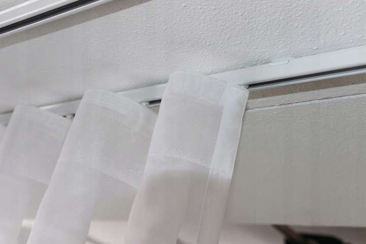 ✅ Французька булавка прикріплена до ковзанок, вставлених у стельову рейку.