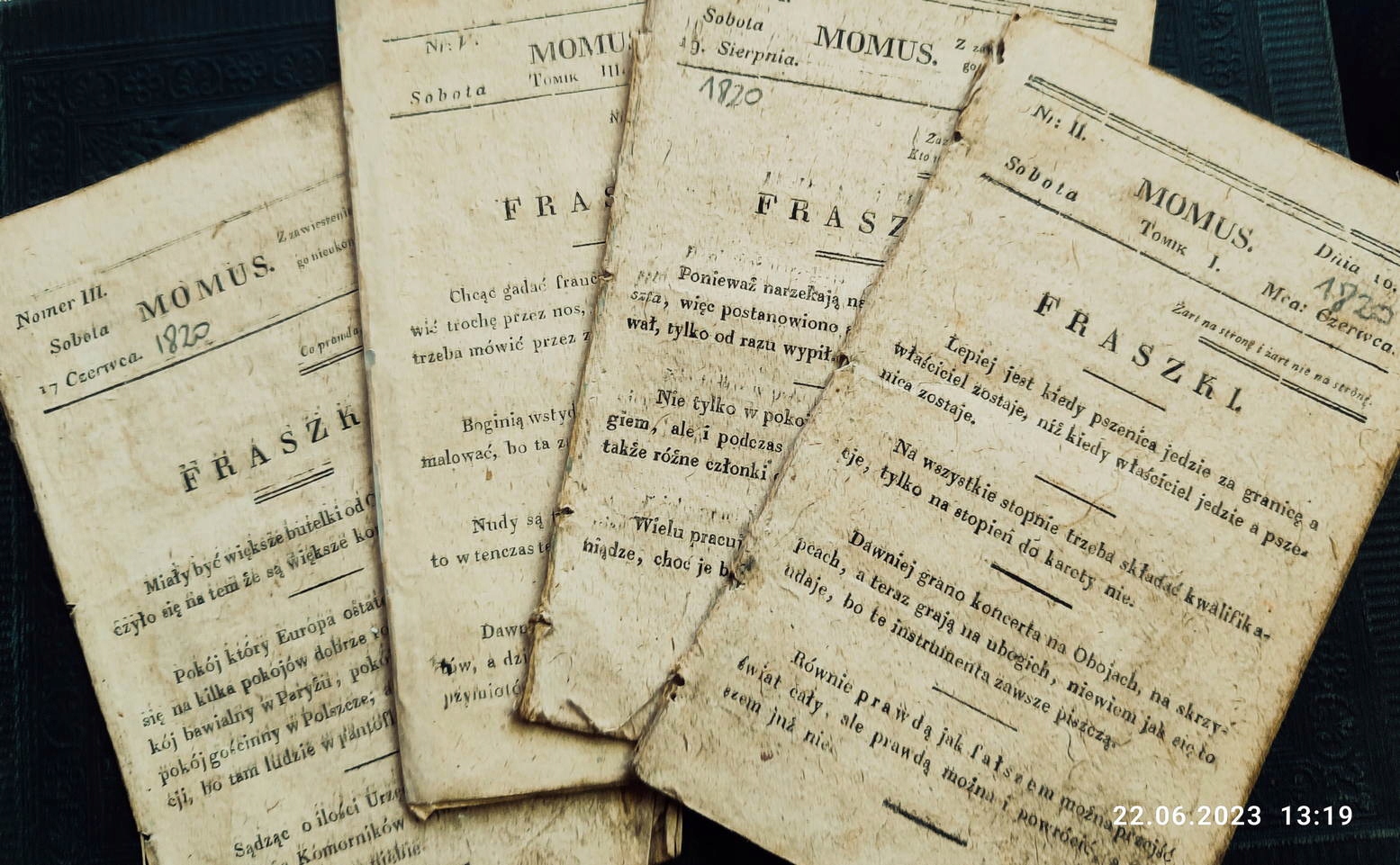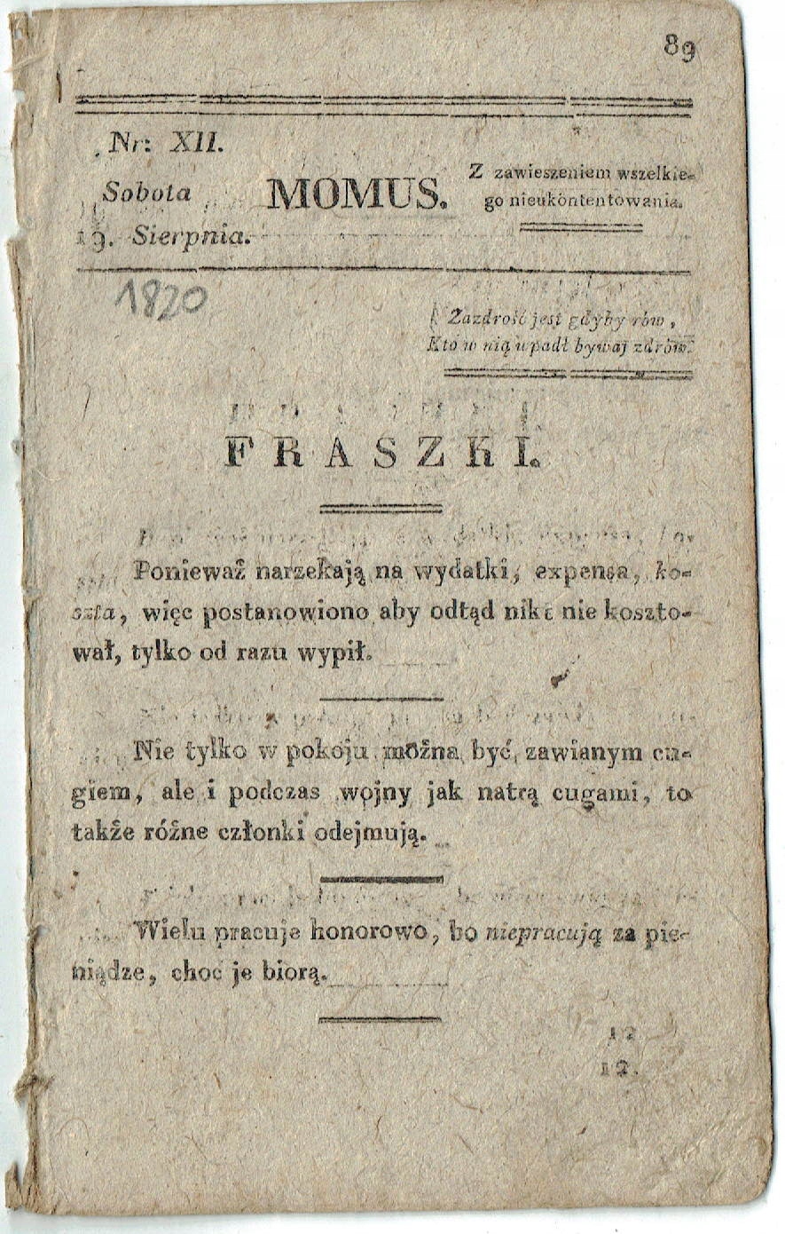 Чотири екземпляри журналу "Momus" мають 8 сторінок, розміри 17 x 10 см. Понад двохсотлітній випуск розважально-сатиричного журналу. Містить - Епіграми, Анекдоти, Калабри, Шаради, Звіти тощо...
