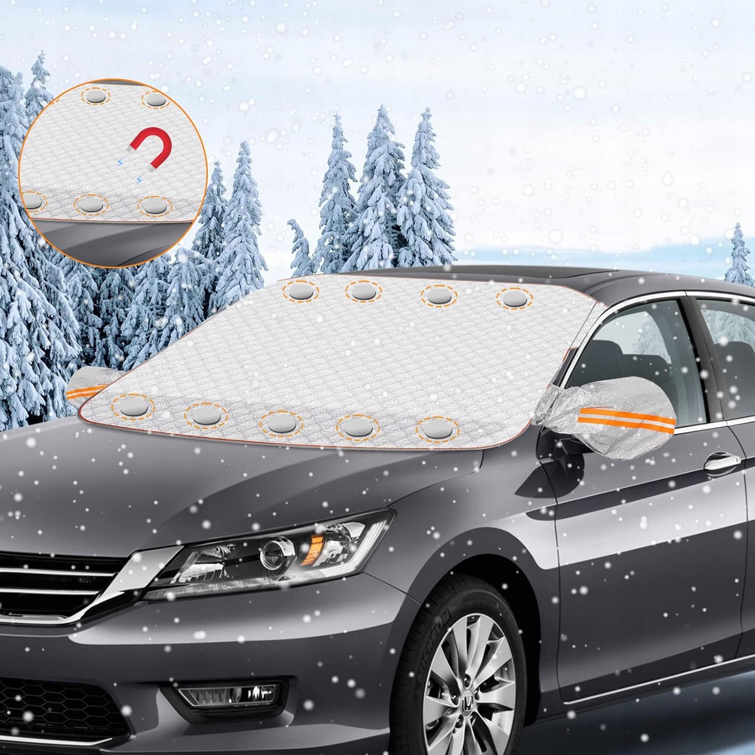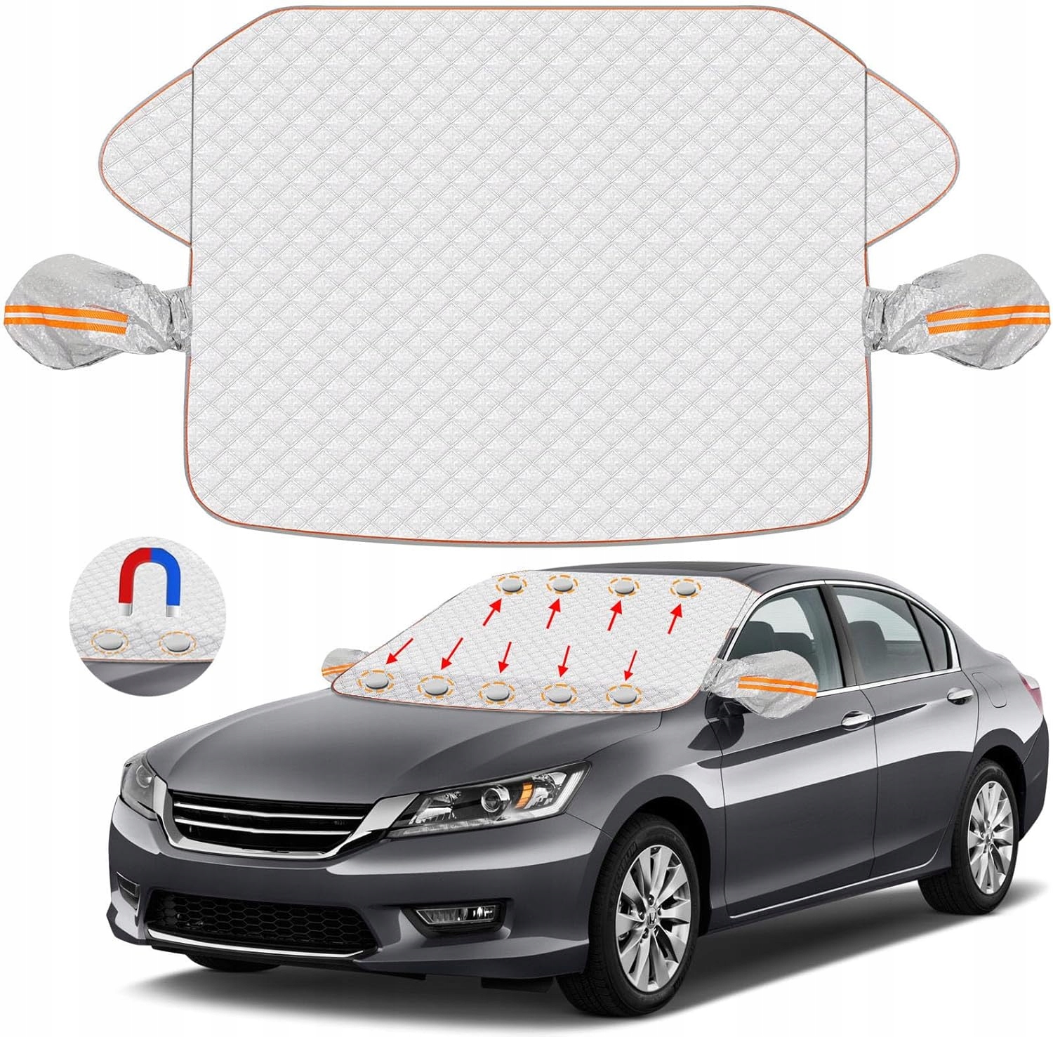 Сонцезахисний навіс на лобове скло автомобіля, оснащений 9 магнітами, забезпечує стабільне кріплення, не турбуючись про ковзання. Завдяки магнітним точкам кріплення чохол легко надягати та знімати, ефективно блокуючи сонячне світло та захищаючи салон автомобіля від нагрівання.