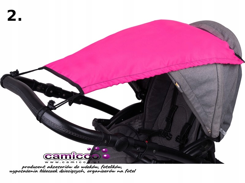 Навіс кріпиться за допомогою еластичної стрічки, яка проходить через навіс. Спереду прив'язується двома шнурками до ручки коляски. Додатково козирок можна регулювати за допомогою шнурка і стопорів. Залежно від кута сонячних променів, ви можете зрушити кришку вбік, відрегулювавши її за допомогою мотузок і гуми