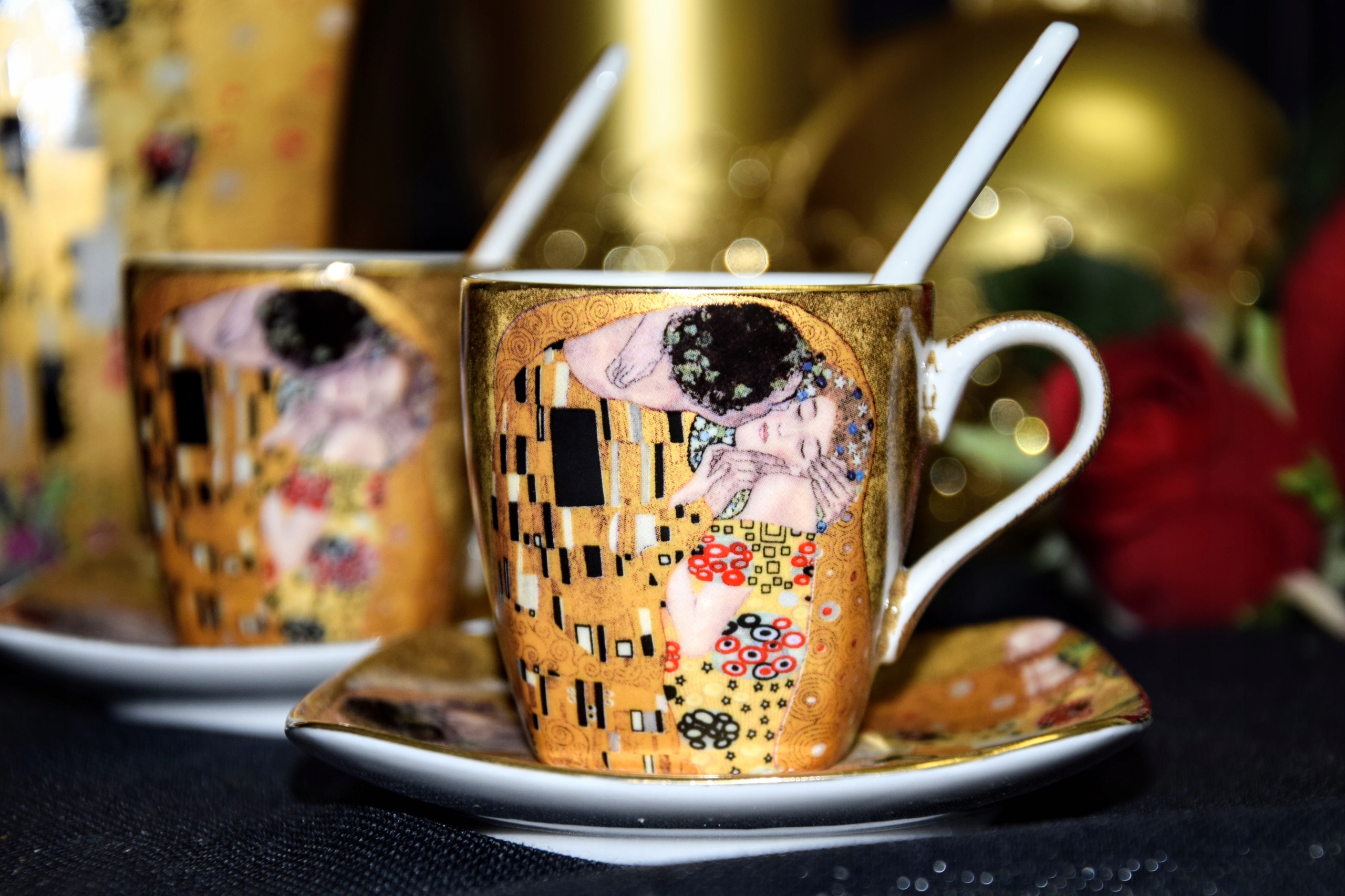 Елегантний набір з 2 чашок, ложок і тарілок з мотивом картини "Поцілунок". Ідеальна ідея подарунка для любителів творчості Густава Клімта або модерну.