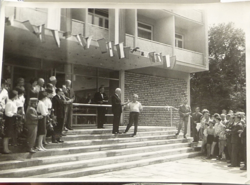 Фото, на якому показано церемонію перед будинком туриста в Кракові (тепер готель Wyspiański) на вул. Вестерплатте Ліворуч персонал готелю (імовірно адміністрація, персонал, кухарі, коридорний. Посередині диктор/посадова особа [?], один із них тримає мікрофон, праворуч мешканці міста та гості, які спостерігають за подією. .На задньому плані будівля готелю, прикрашена національними прапорами багатьох країн.Формат 18х13 см, хороший стан.Звороту печатка фотокореспондента [ КРАКІВ ][ АРХІТЕКТУРА ] [ СТАРІ ФОТО ][ СИТУАЦІЙНА ФОТОГРАФІЯ ][ PRL ][ ТУРИЗМ ] [ ГОТЕЛЬ ]1210C