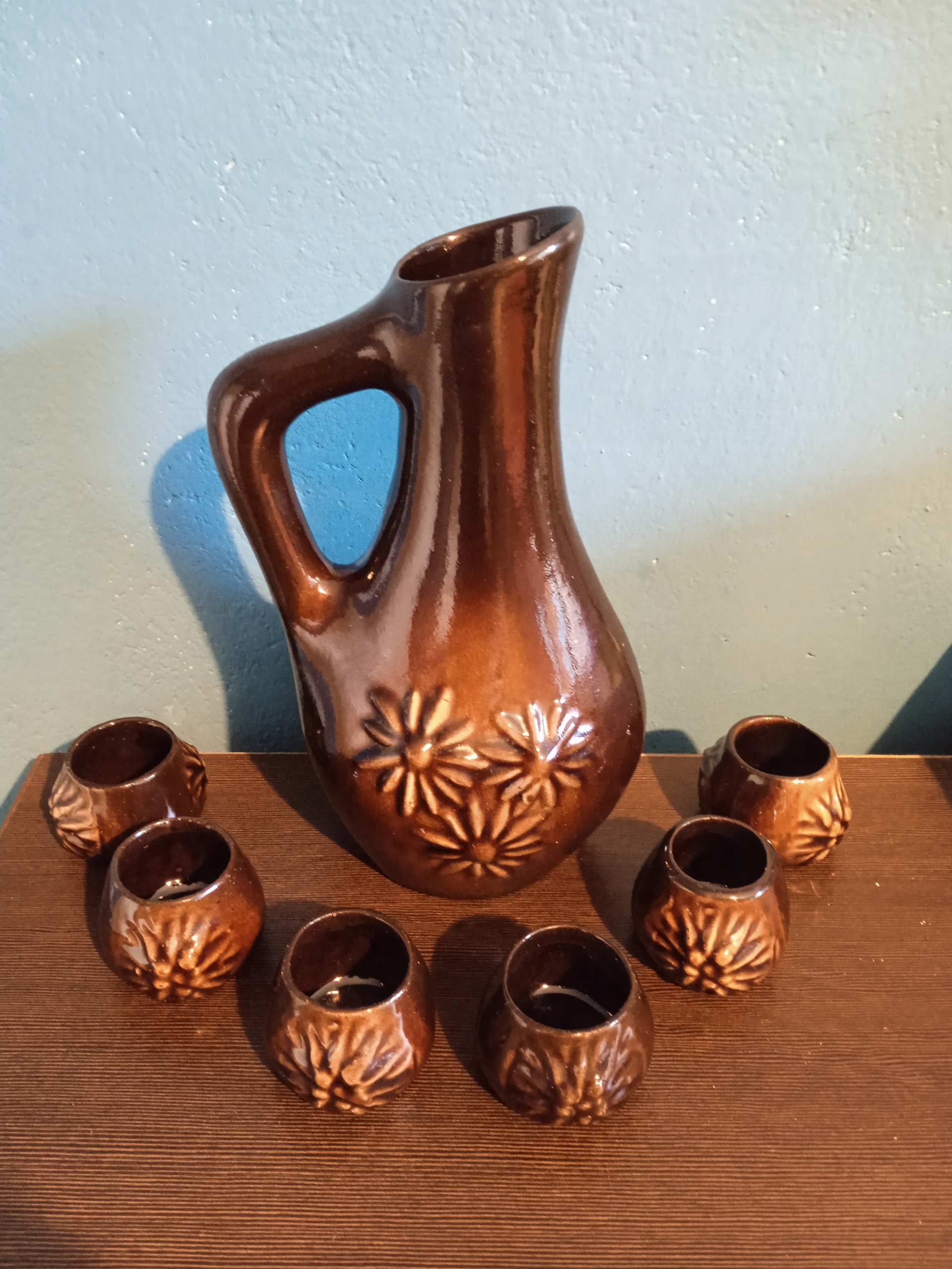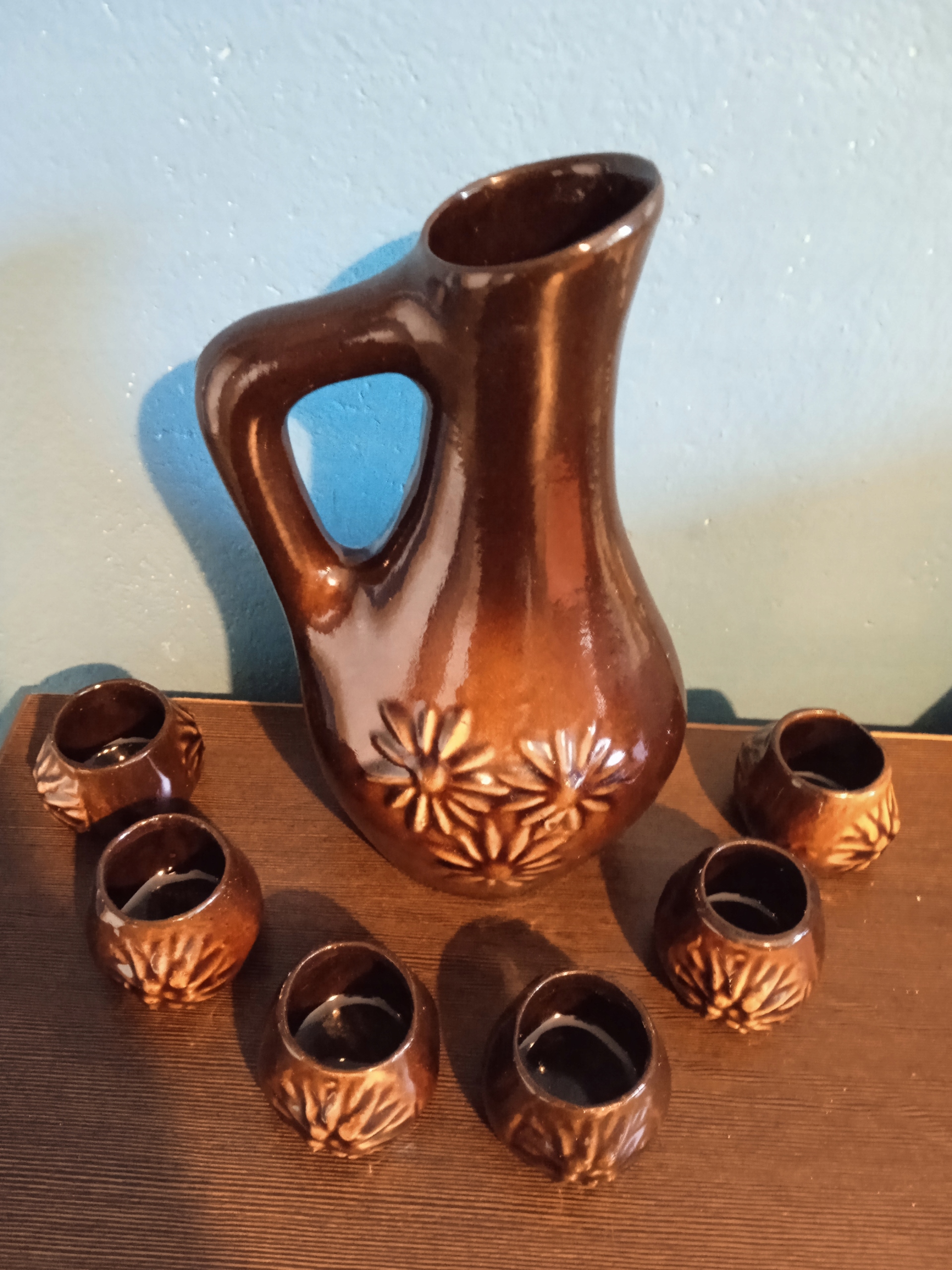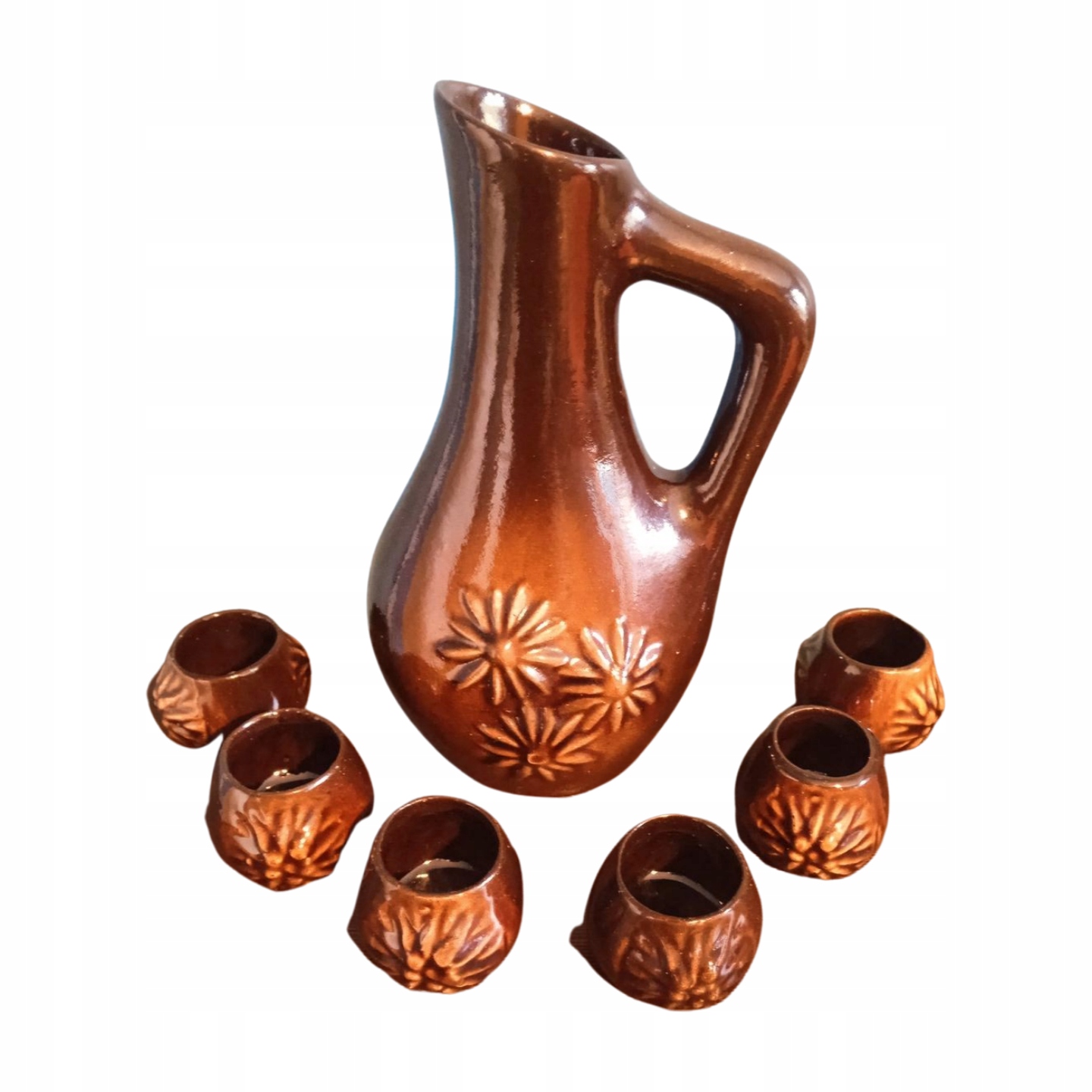 Пропоную на продаж глечик - графин в комплекті з 6 склянками, виробництва Millenium Cooperative - Ceramika Krakowska з 1960-х років. Вироби з глазурованої кераміки, в дуже хорошому стані. Ніколи не використовувалися – стояли у вітрині як прикраса. З боків вишукані прикраси у вигляді опуклих квітів. Висота глечика - 21,5 см. Діаметр (від верху) 5,3 / 11 / 8 см. Келихи - висота 3,7 см. Діаметр (зверху) 3,4 / 4,3 см.