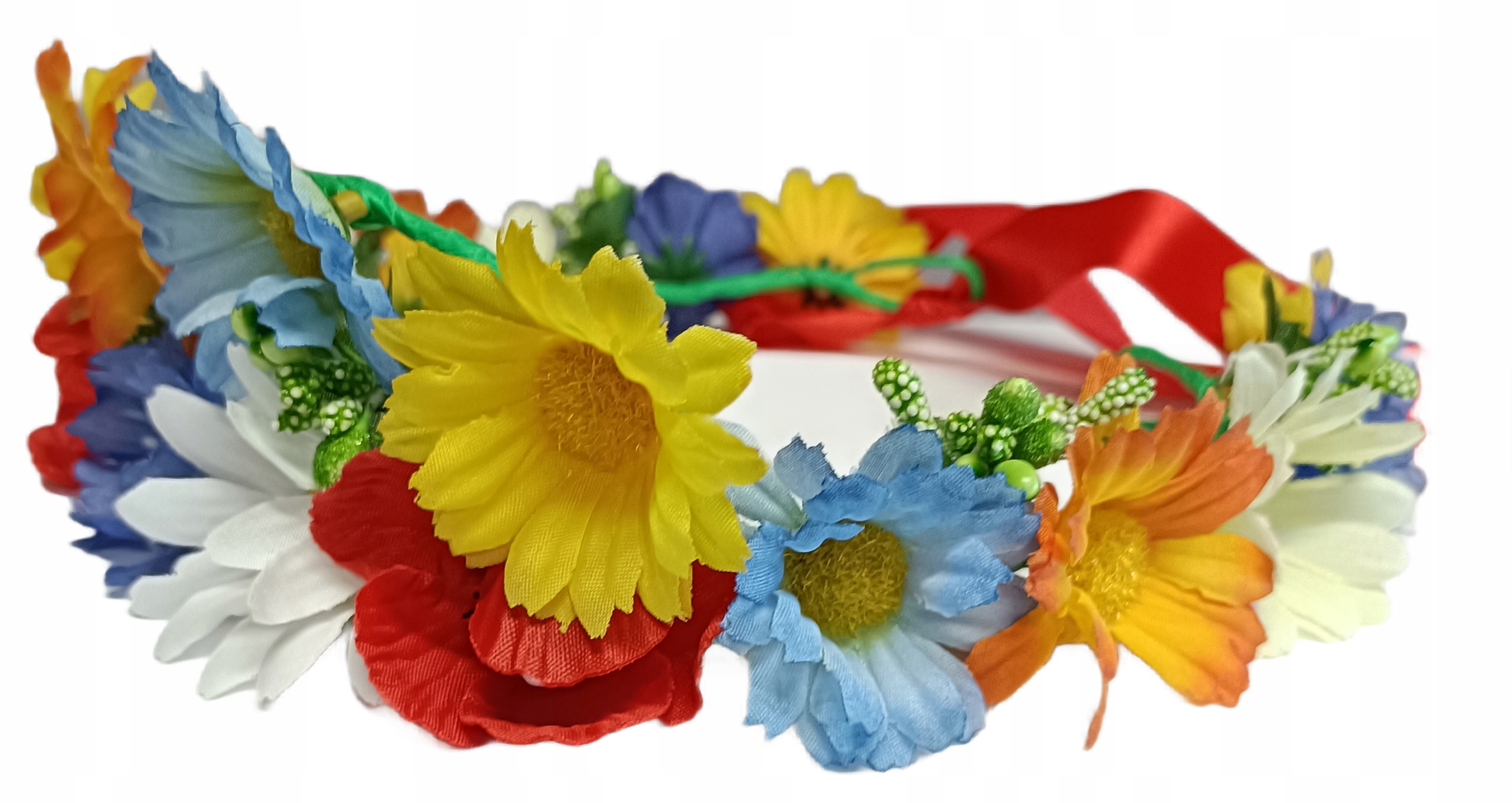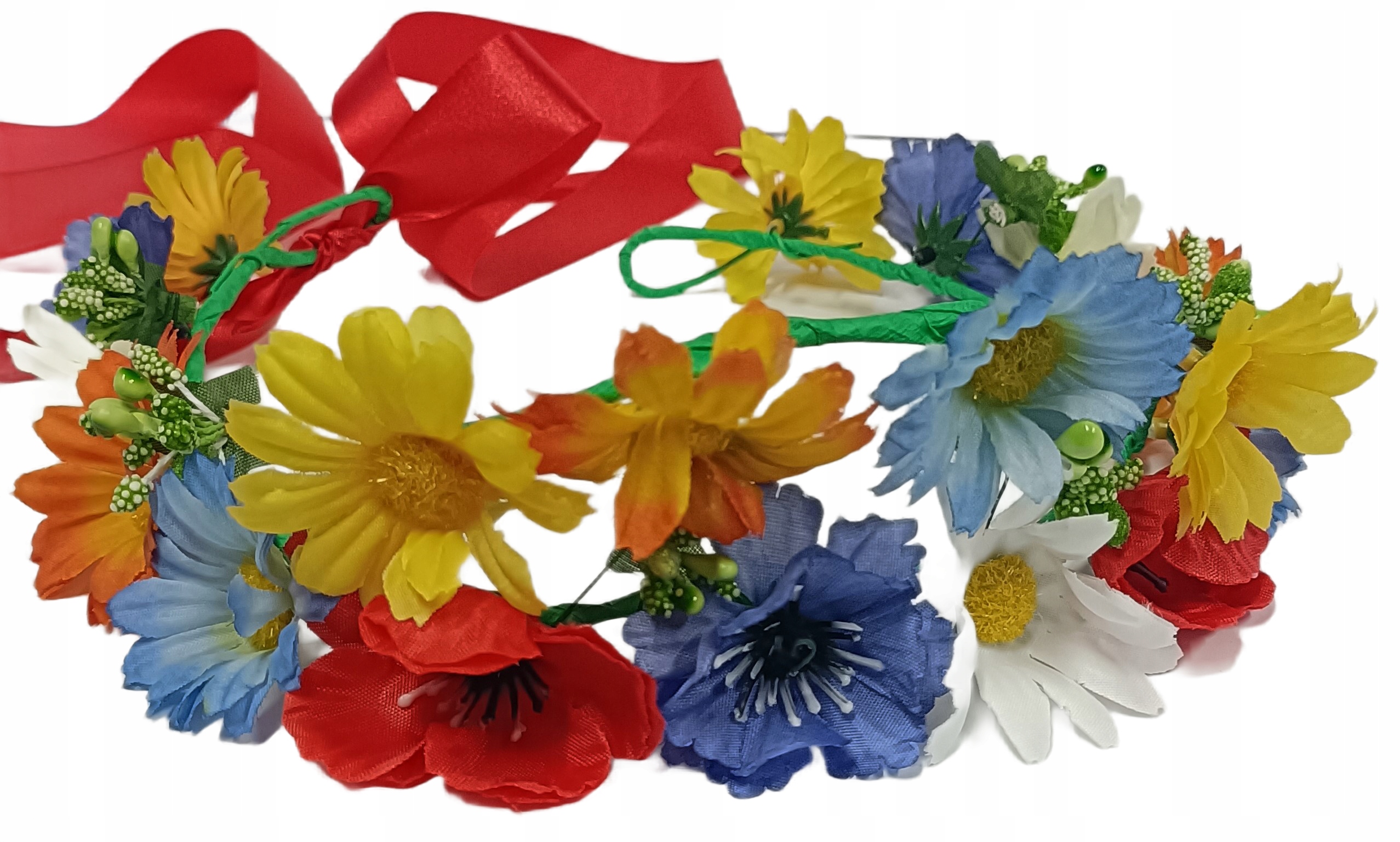 Вінок був виготовлений зі штучного матеріалу. квіти жовтого, червоного та синього кольорів.