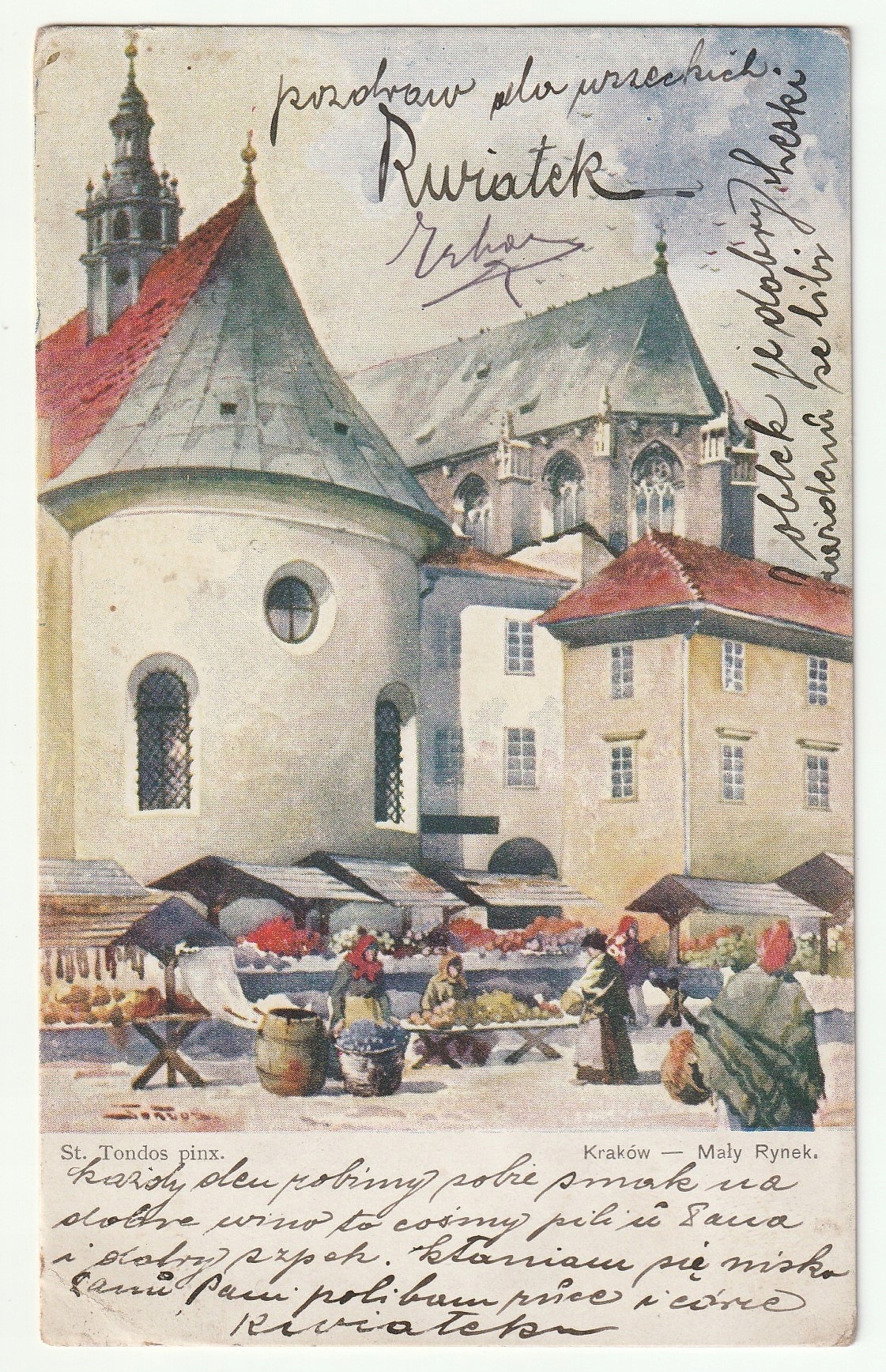 КРАКІВ. Малий Ринок, вул. Tondos pinx, ред. вид. Видавництво Салону польських художників, Краків до 1915; кольор., вгорі та внизу рукописні записи, плями, гарний стан, тираж.