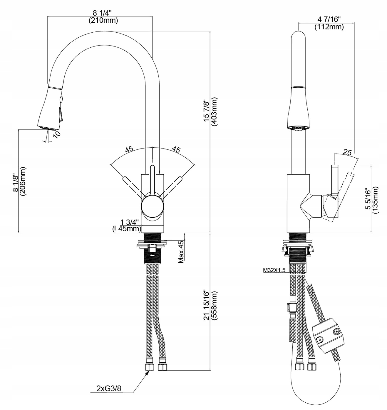 - Усі шланги встановлені на змішувачі на заводі, що робить установку швидкою та легкою