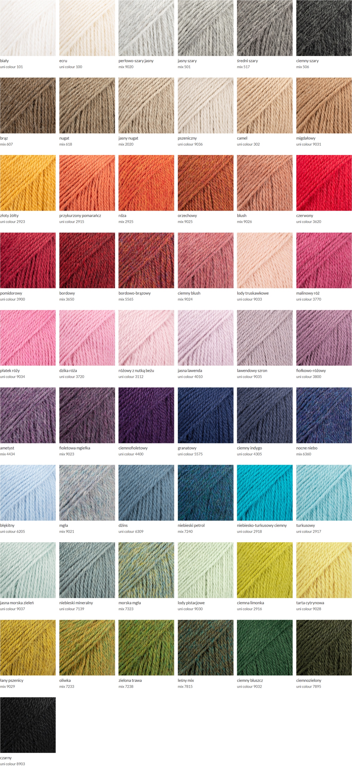 складається з 3 сильно переплетених ниток, щоб забезпечити його виняткову довговічність. Він поставляється в багатьох кольорах, від найлегшого до найтемнішого. Міцний, природний і в різнокольоровій суміші. Останнє зроблено таким чином, що барвисті волокна переплітаються разом, перш ніж крутить шерсть, завдяки якому ми отримуємо ефект суміші.
