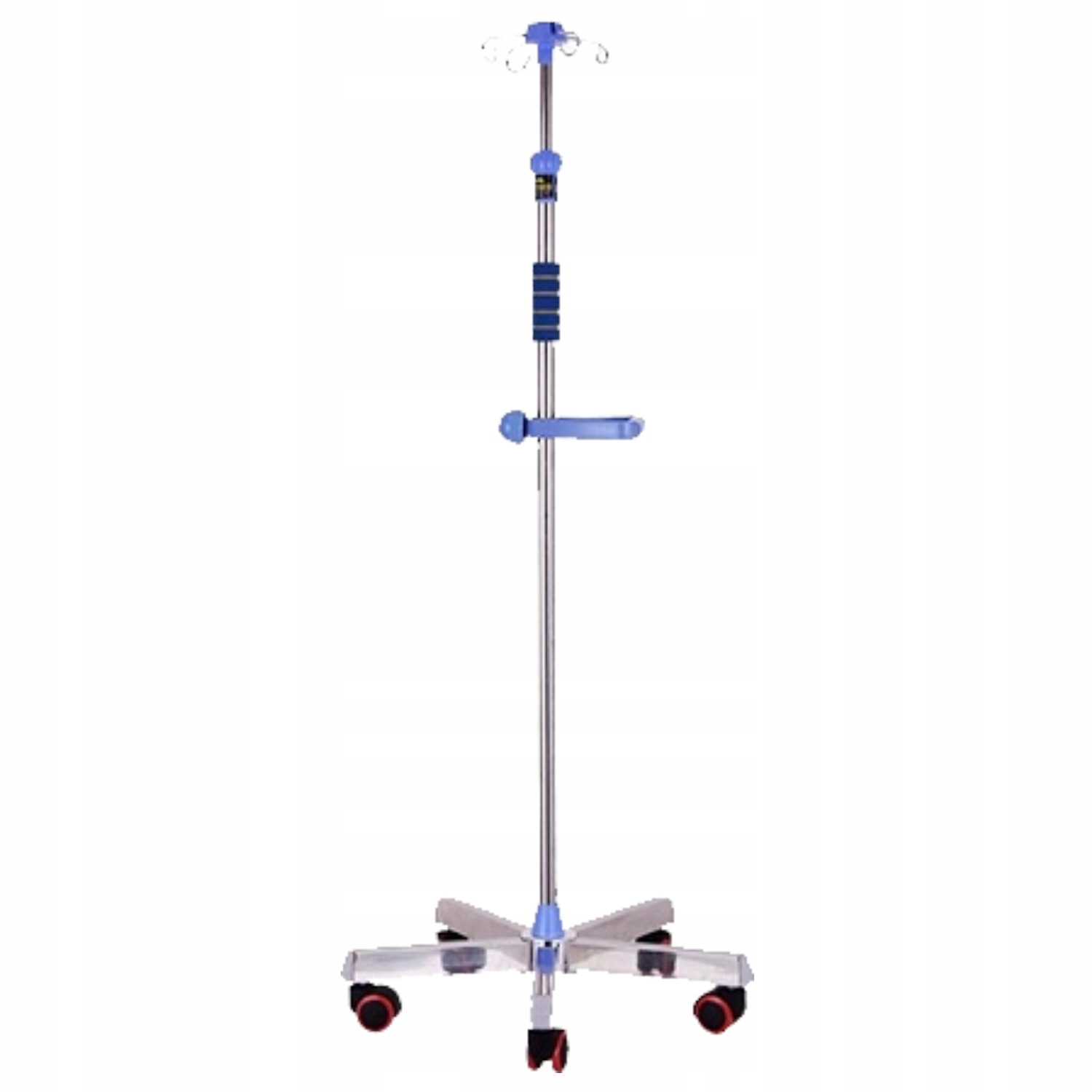 Стійка виготовлена з нержавіючої сталі та пластикової основи . Основа підставки складається з5 ніжок, оснащених пластиковими колесами. Два колеса додатково мають гальма для блокування коліс. Стенд оснащений 4 металевими тримачами для підвішування крапельниць або інших пакетів з рідинами.