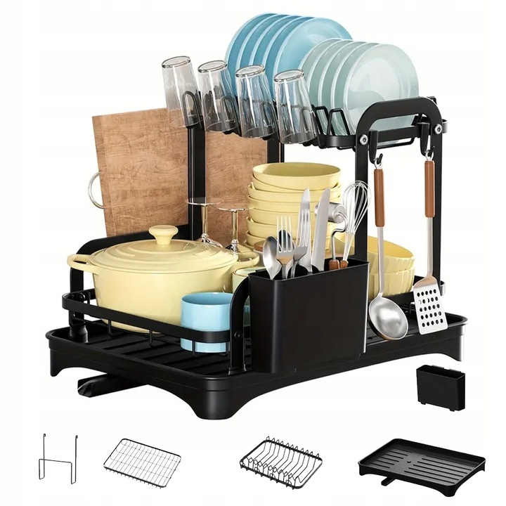 🍽️ 【Повний комплект аксесуарів】 Це багатофункціональна підставка для сушіння посуду, оснащена підстаканником і тримачем для кухонного приладдя. Він пропонує місце для майже всього кухонного начиння та має функцію зливу. Дворівнева стійка для сушіння посуду, верхній шар може вмістити багато тарілок різного розміру, нижній шар може вмістити багато мисок або чашок, або навіть каструль і сковорідок.