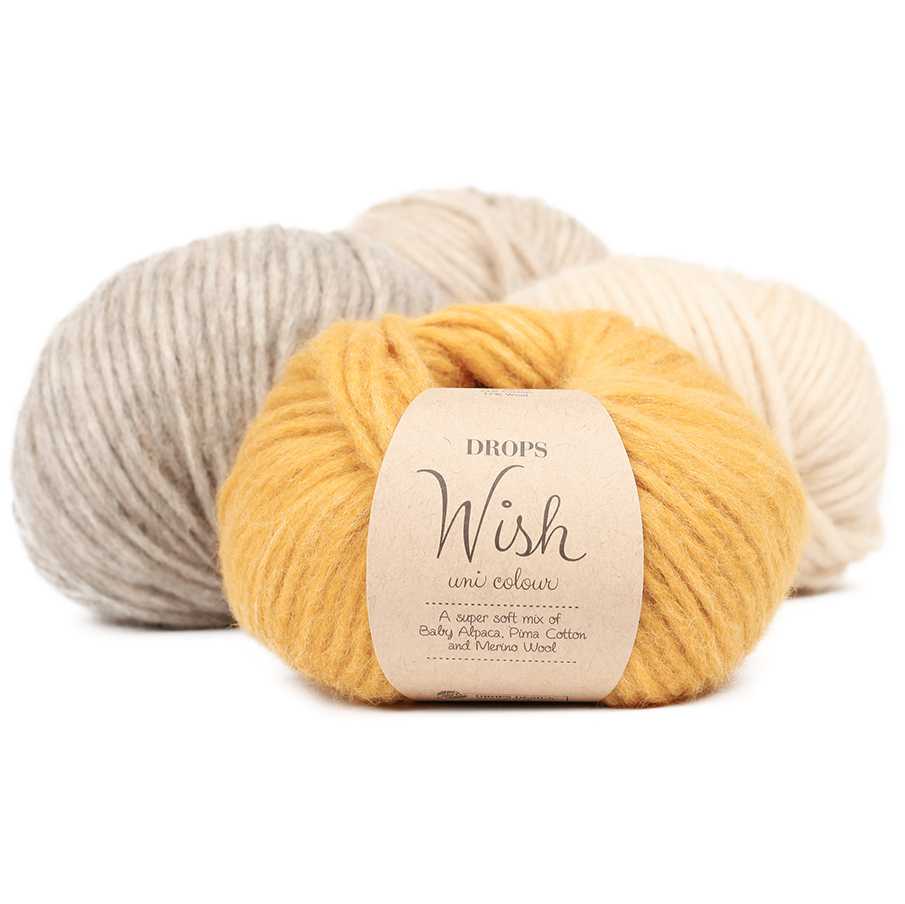 Пухнаста, легкий і повітряний, як DROPS Air, густий, як DROPS Snow, DROPS Wish стане ідеальним вибором для модних жилетів, зручних светрів і товстих аксесуарів, таких як шапки, шарфи або шарфи.