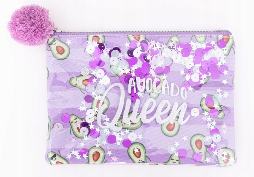 Авокадо з одним відділенням косметичка з фіолетового матеріалу з модним малюнком авокадо. На передній частині косметички є прозора накладка з різнокольоровими конфетті. На косметичці сріблястий напис Avocado Queen. Косметичка закривається на блискавку. На блискавці кріпиться фіолетовий помпон.