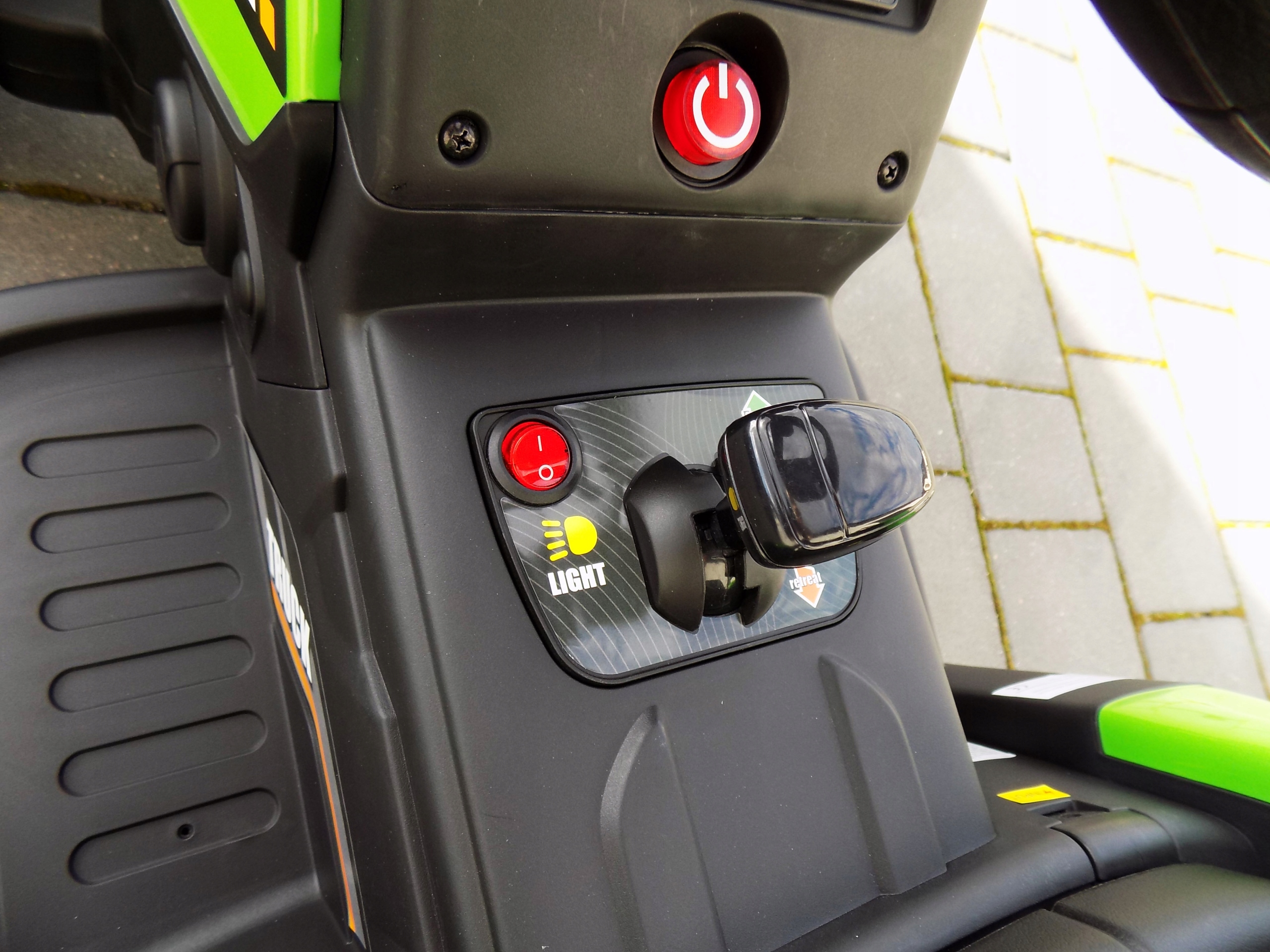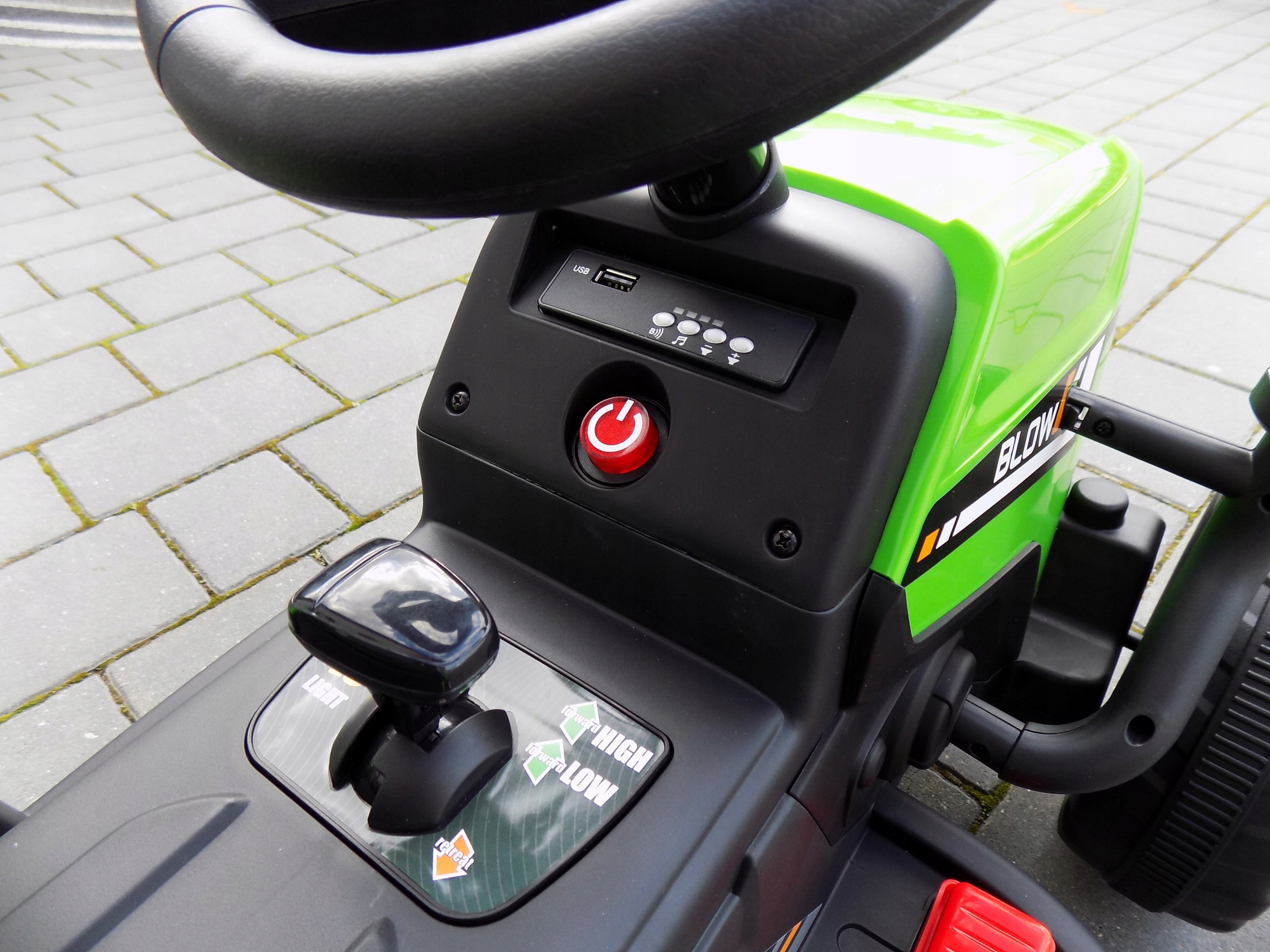 Батьки мають повний контроль над поїздкою своєї дитини - у будь-який момент вони можуть використовувати пульт дистанційного керування, щоб відреагувати на поїздку своєї дитини (в інших моделях можна кататися з дистанційним керуванням лише після перемикання перемикача ПДУ, тут там немає такого перемикача). Завдяки цьому рішенню, коли батьки бачать, що їхня дитина їде в неправильному напрямку, вони можуть негайно відреагувати за допомогою пульта дистанційного керування - змінити напрямок руху або, в цій версії, негайно зупинити транспортний засіб - функція STOP на пульті дистанційного керування. Крім того, можна встановити 1 із 3 швидкостей руху за допомогою пульта дистанційного керування.