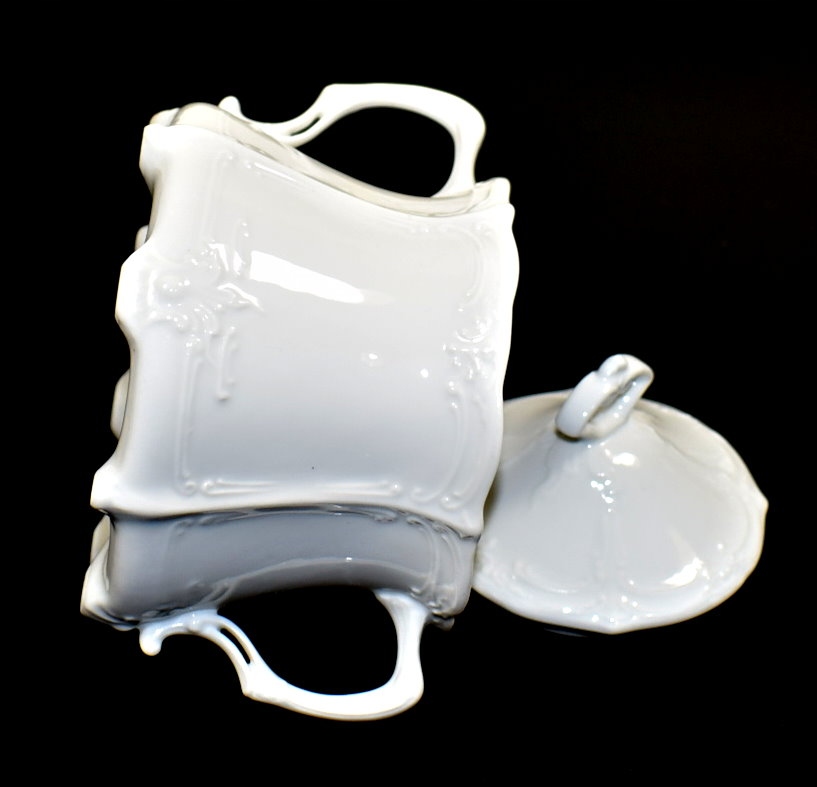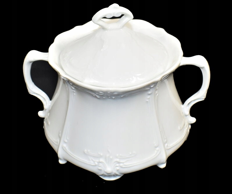 Цукерниця-цукерниця з ніжної порцеляни білого кольору, прикрашена гарними рельєфами. Вся на ніжках, ажурні ручки.