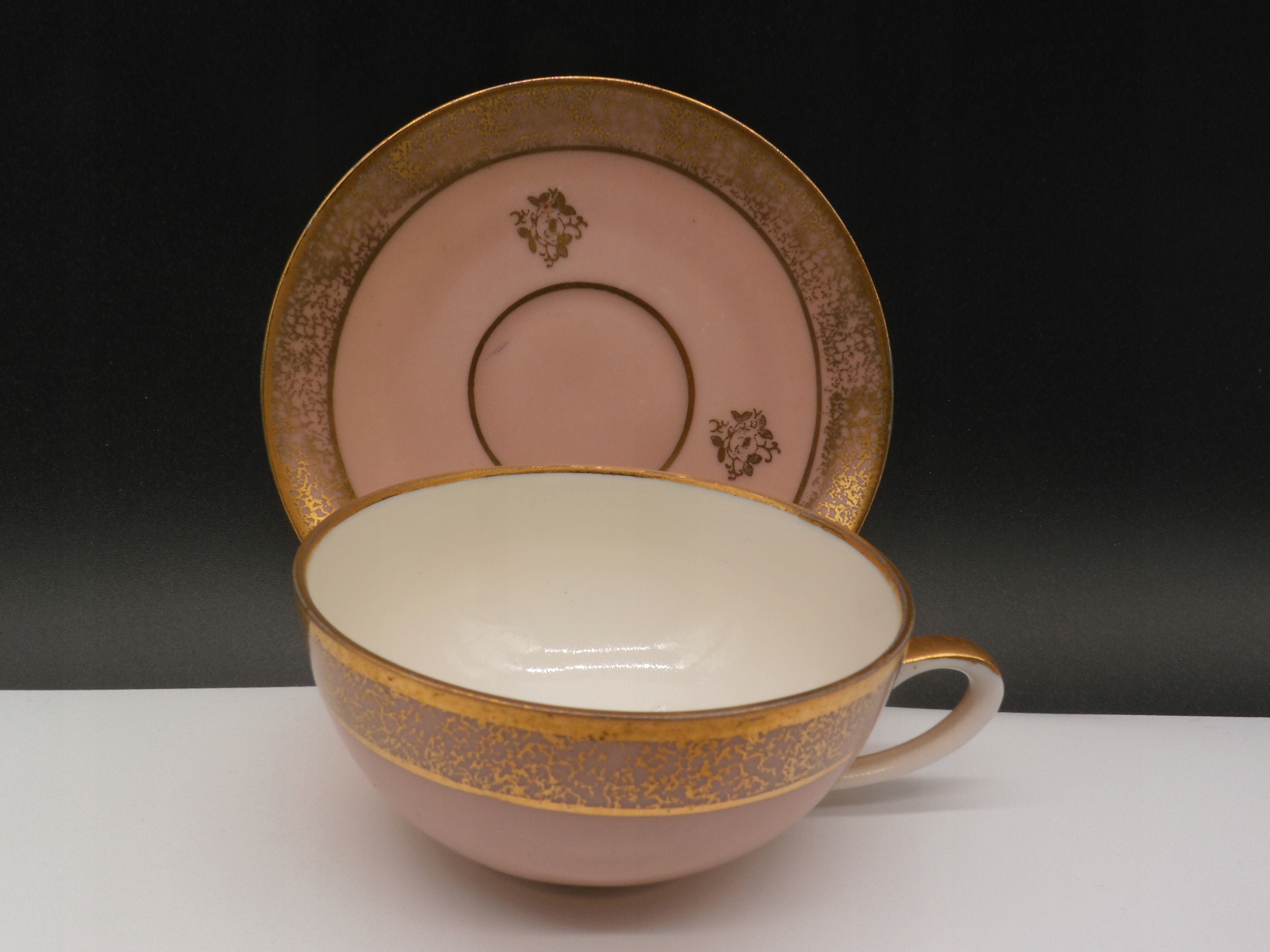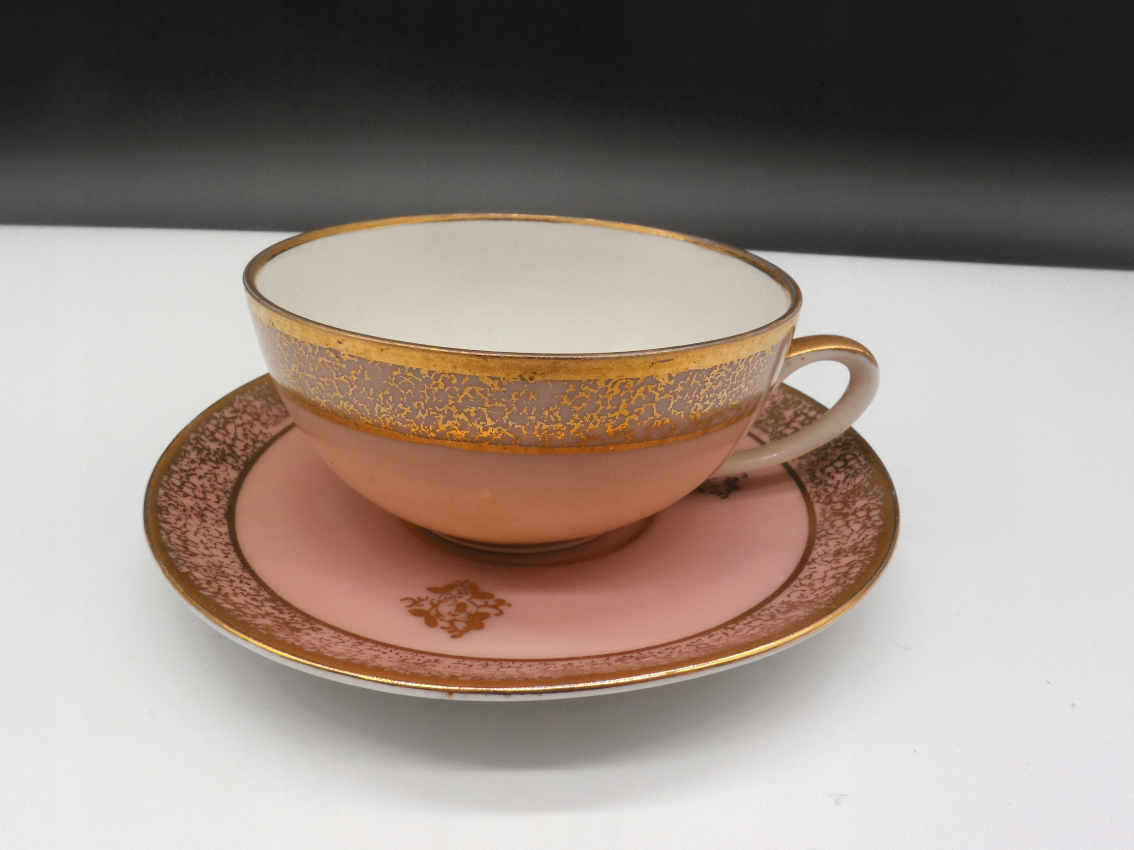 - Блюдце підходить до чашки, має золотий обідок на краю та подібний фактурний малюнок. У центральній частині блюдця золотистий квітковий візерунок.