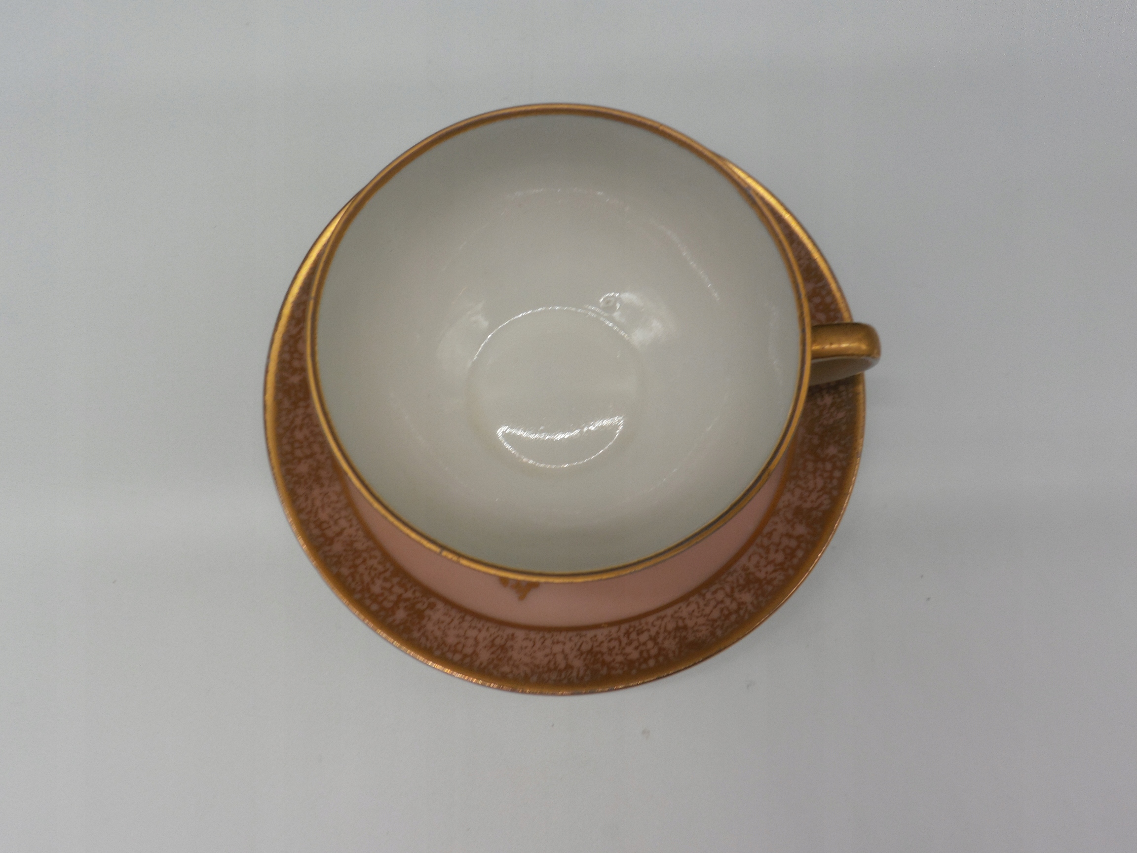 - Чашка має золотий обідок на верхньому краю та широку золоту смужку з фактурним малюнком навколо верху. Внутрішня сторона чашки біла.