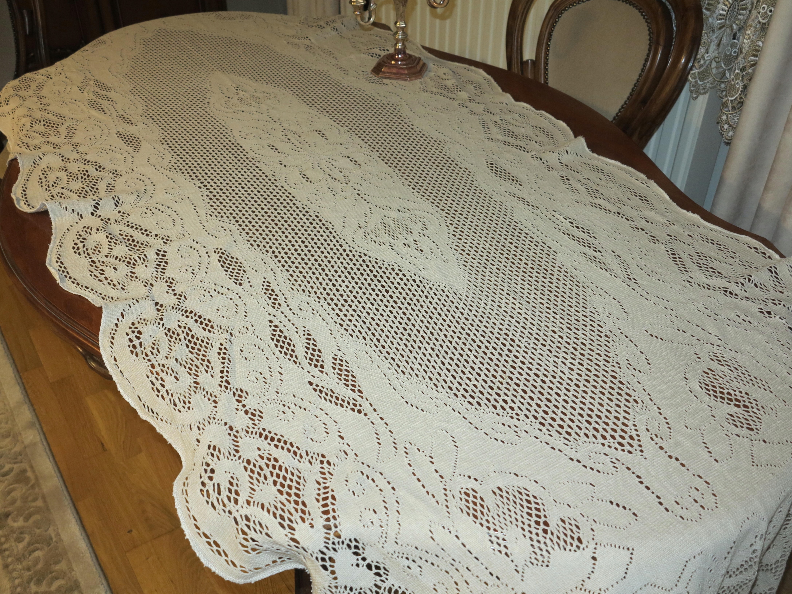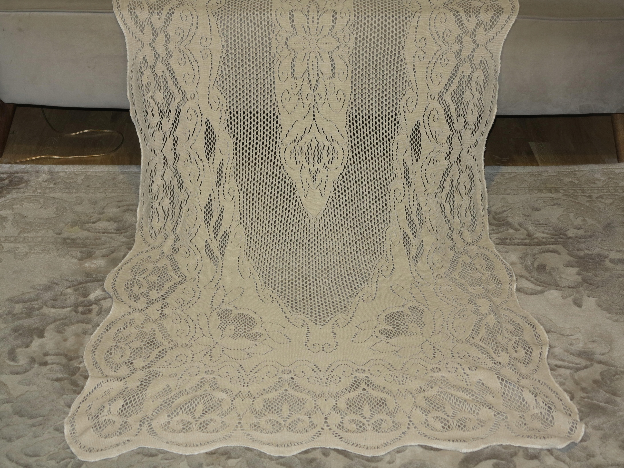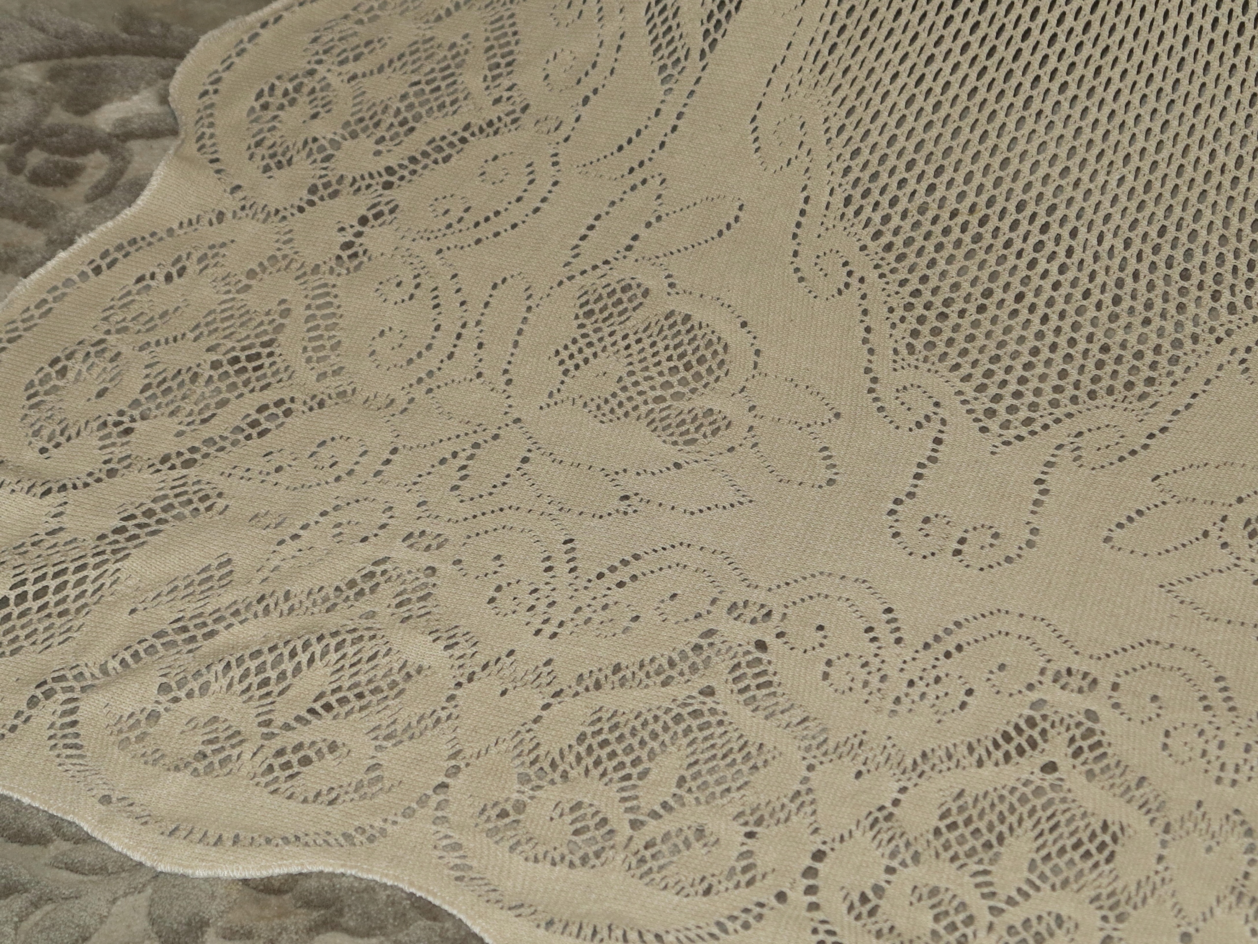 Красива довга скатертина, виготовлена з густого бавовняного мережива стародавнього бежевого 240/100 візерунка
