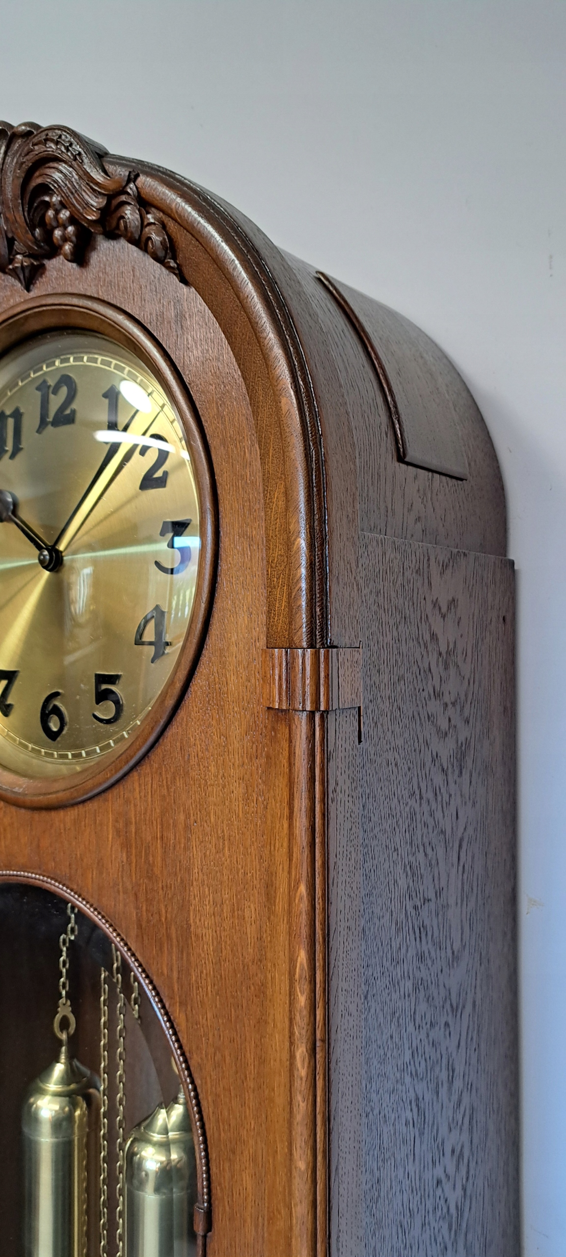 здорова коробка передач, у чудовому стані, механізм у чудовому стані після огляду сторожової. 29 см щит дуже добре збережений, вага та маятник у дуже хорошому стані.