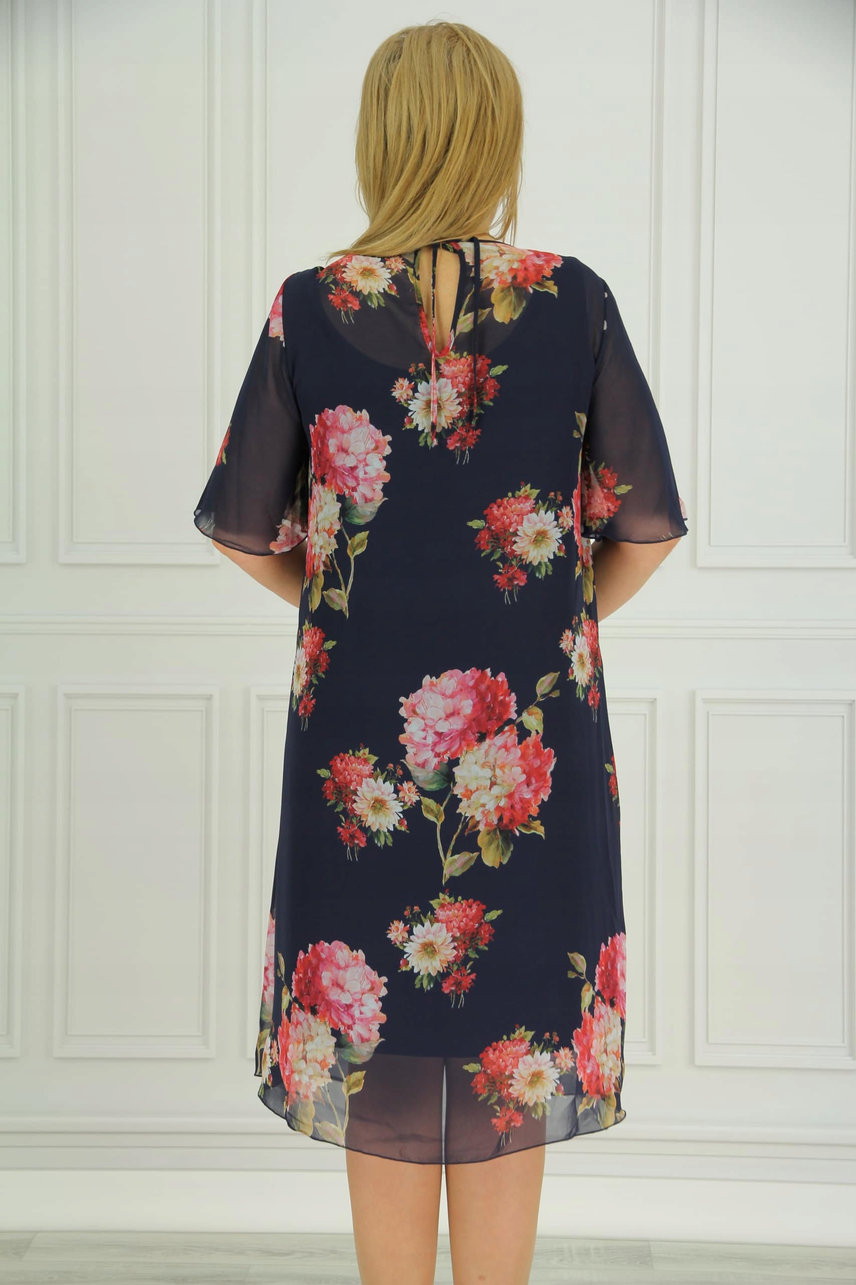 Сукня складається з двох шарів: трикотажний низ адаптується до фігури, а верхній легкий шифон приховує жіночні вигини.