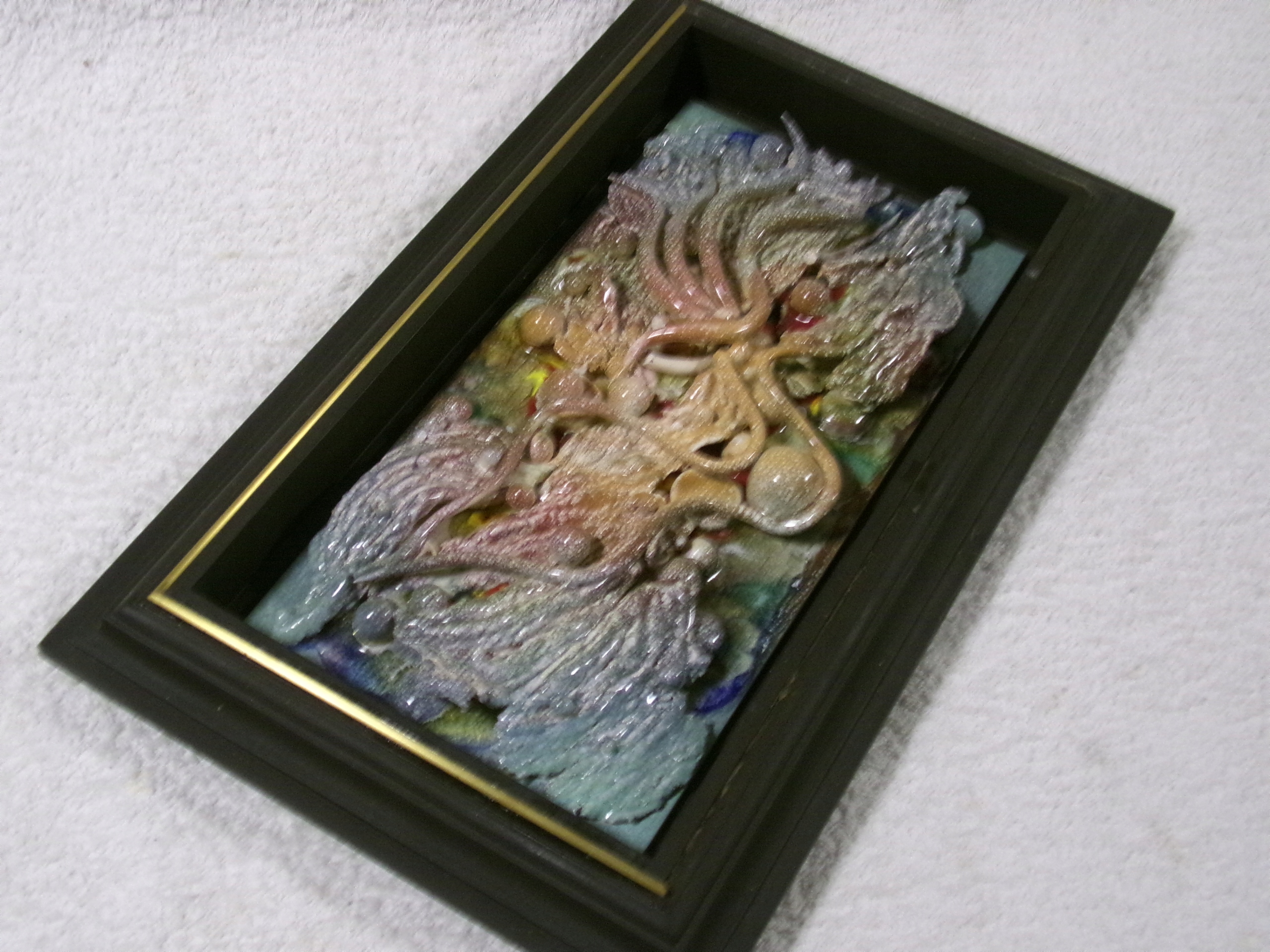 Симпатичне зображення ручної роботи, зроблене з кераміки з дерев’яною рамою з розмірами 38,5х23,5х5 см, вагою 1,61 кг. Криплюється добре, делікатні порожнини, будь ласка, див. Фотографії