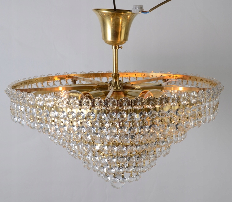 Чудова люстра, щедро прикрашена кристалами, походить з Іспанії з 1960-х років. Всі металеві елементи конструкції виготовлені з латуні золотого кольору. Каркас люстри складається з декількох каскадних обідків з щільно підвішеними скляними кристалами, які красиво розсіюють світло, надаючи кімнаті веселкове сяйво. Великою перевагою світильника є чудово оформлений основний обідок, який прикрашений скляними квітами.