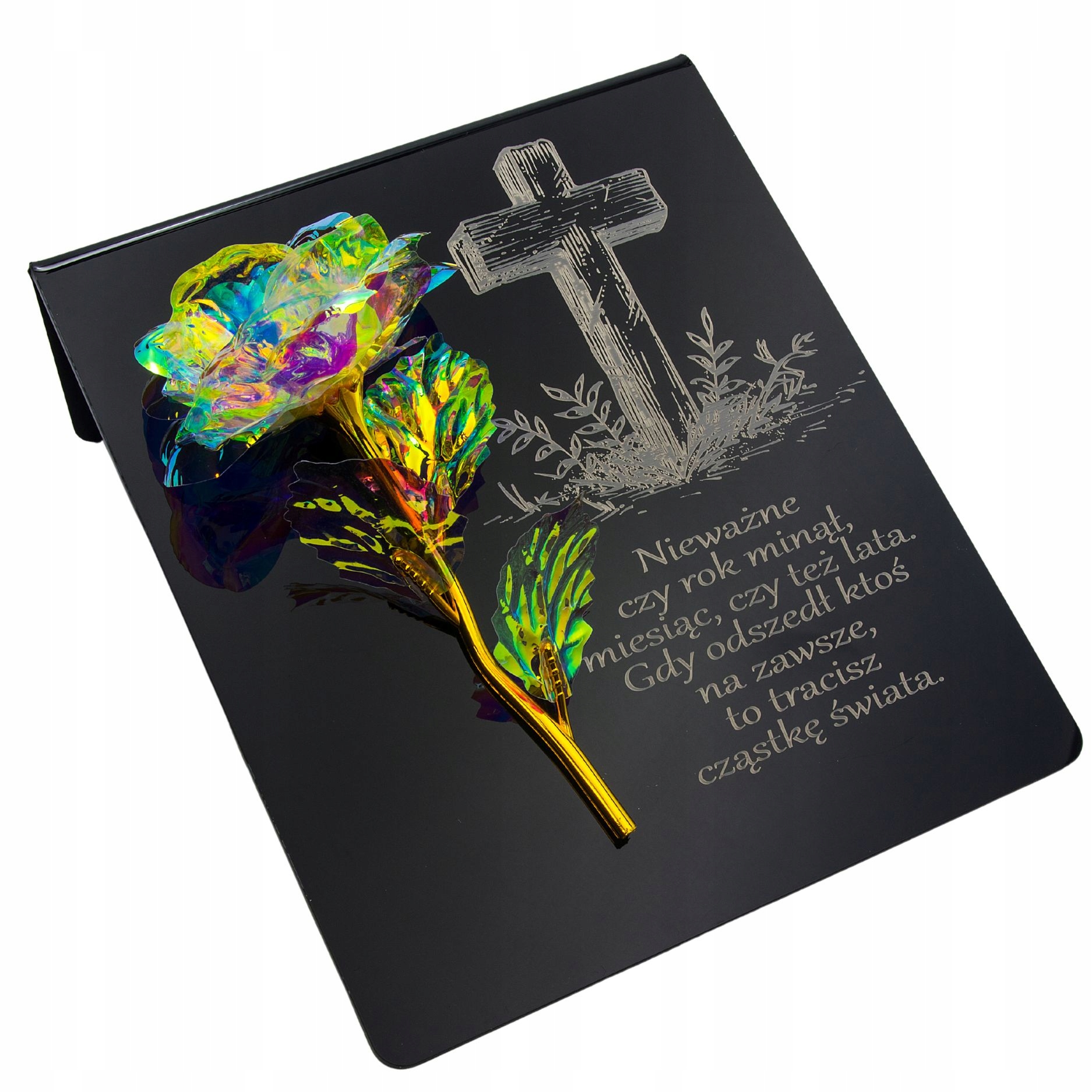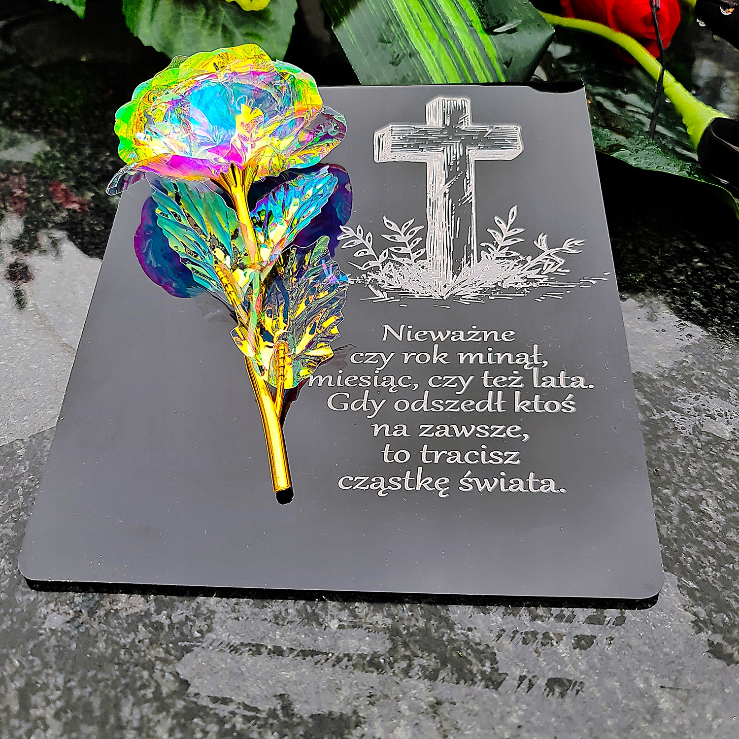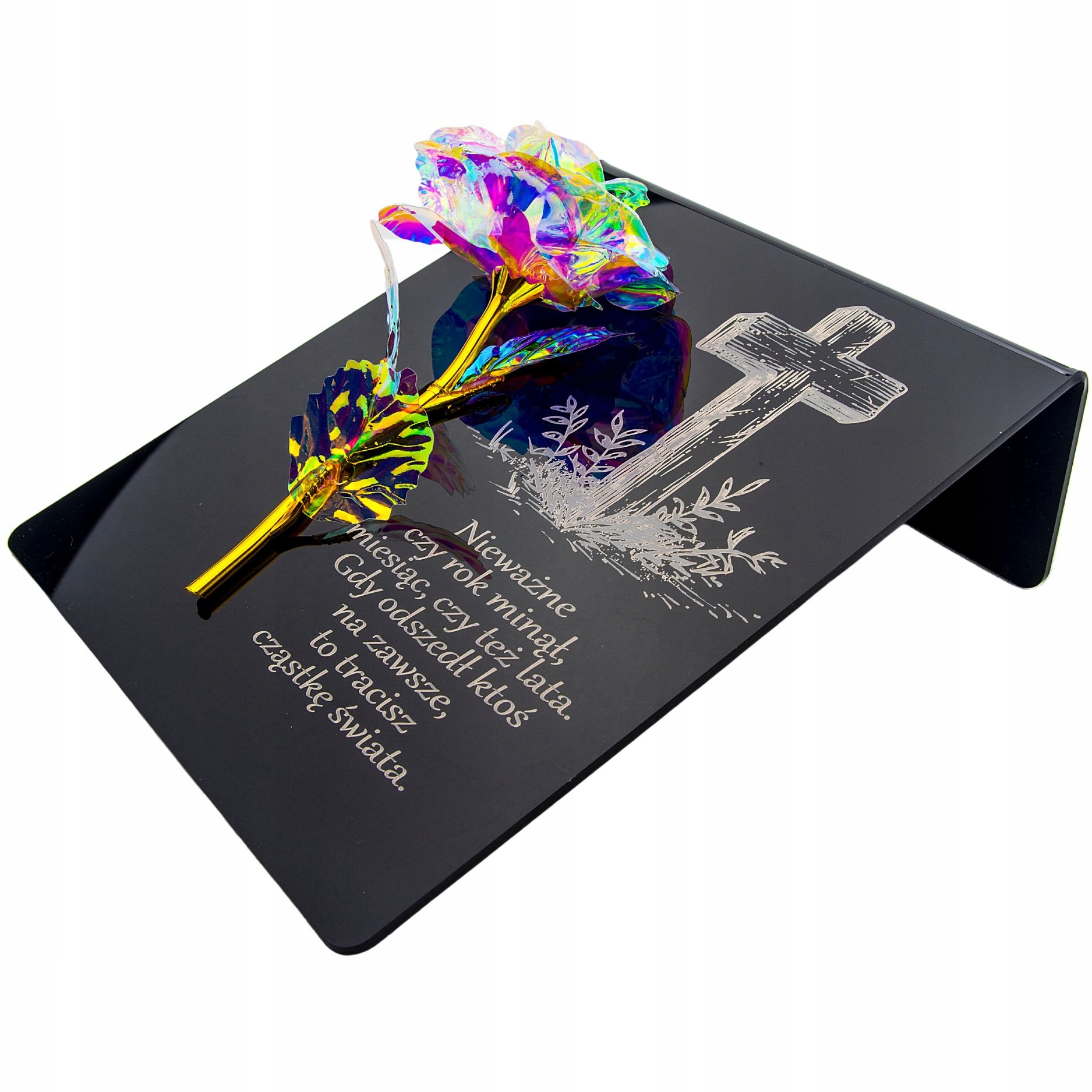 Райдужно-золота троянда на постаменті з гравіюванням