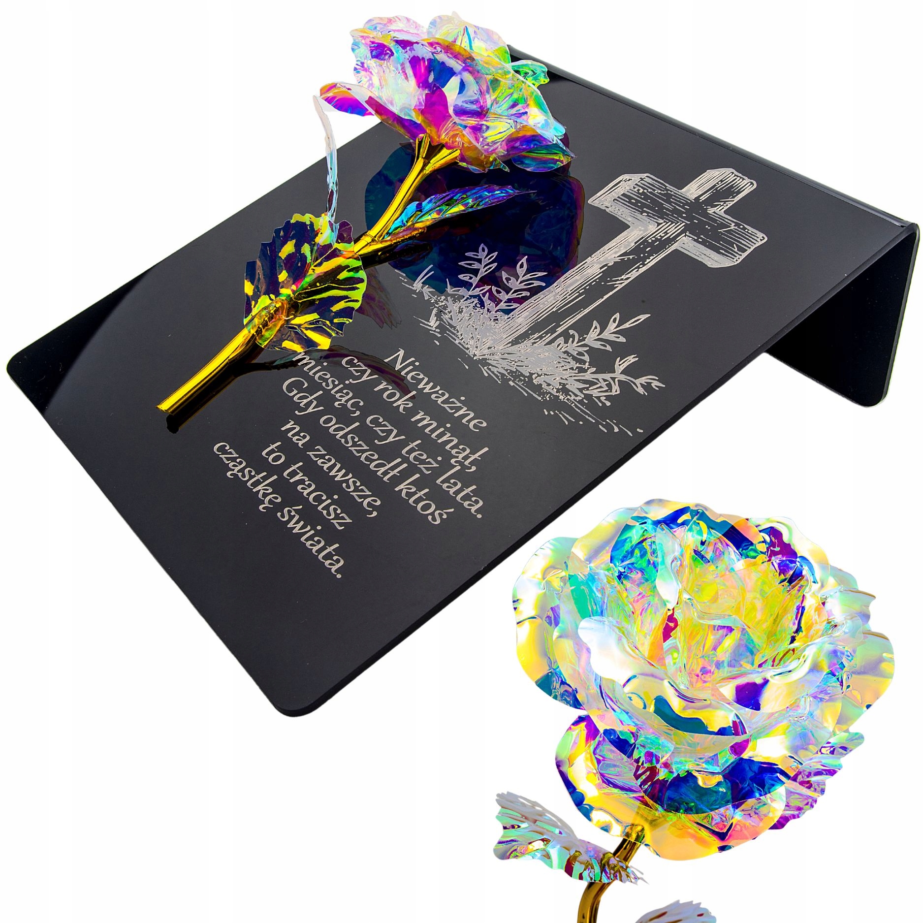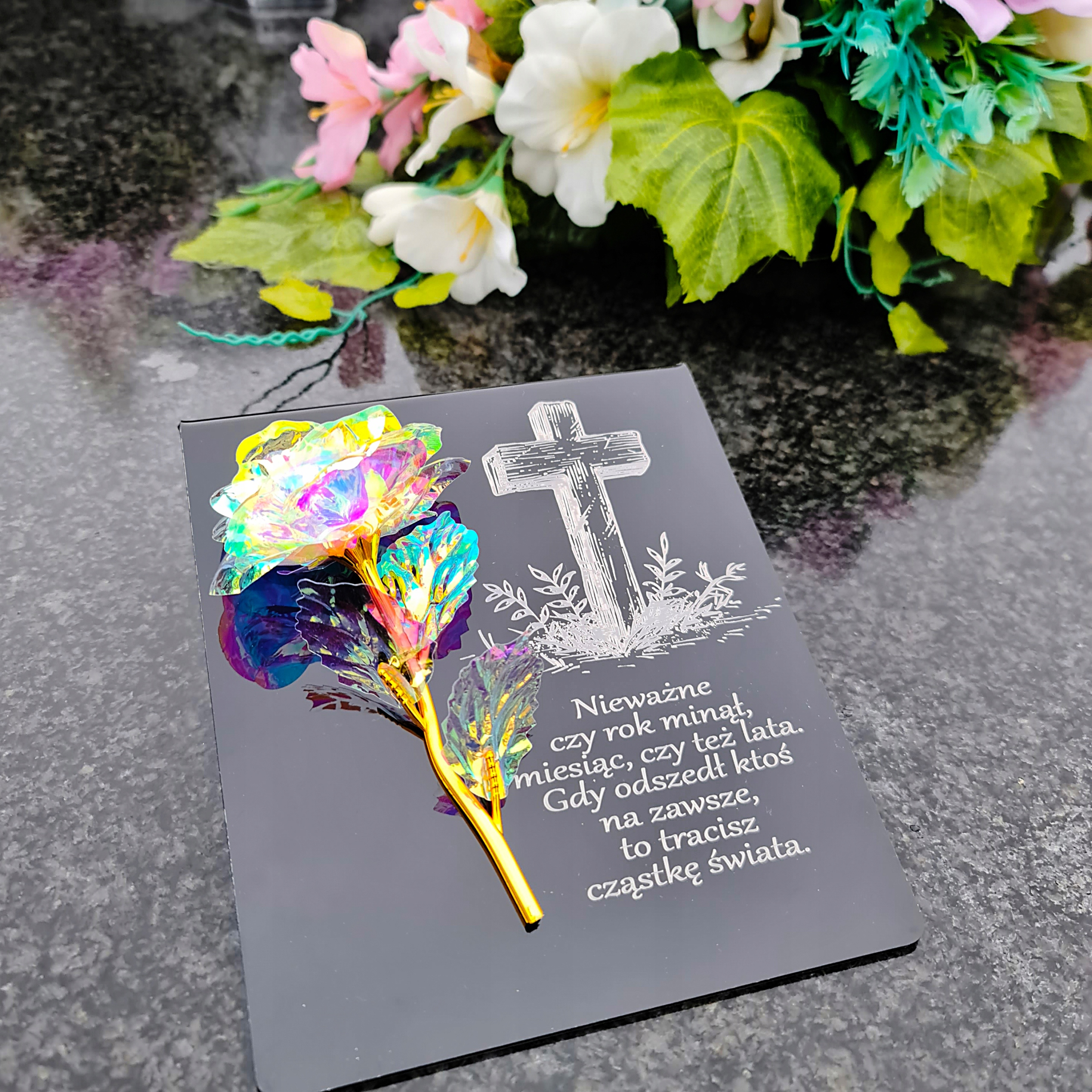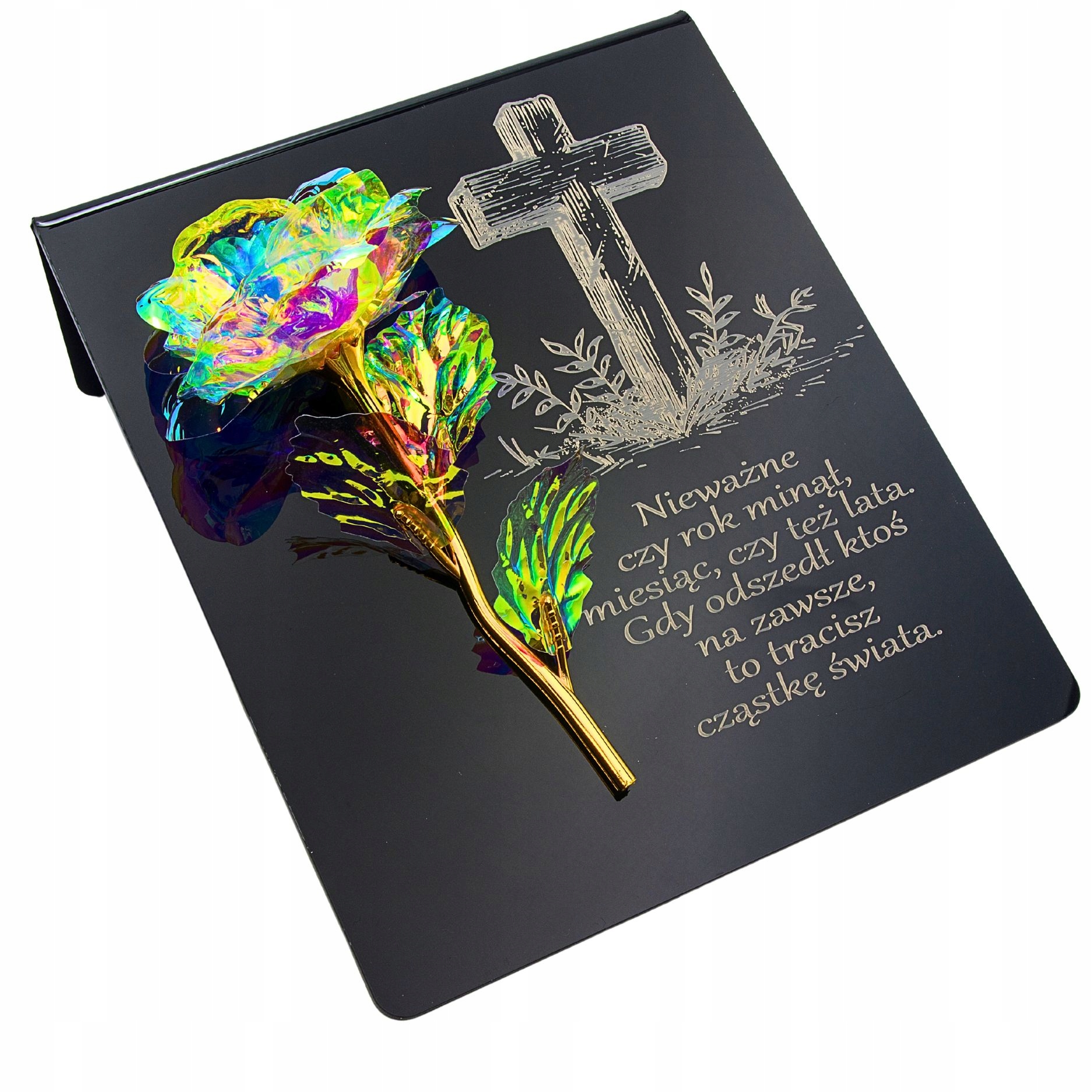Райдужно-золота троянда на постаменті з гравіюванням