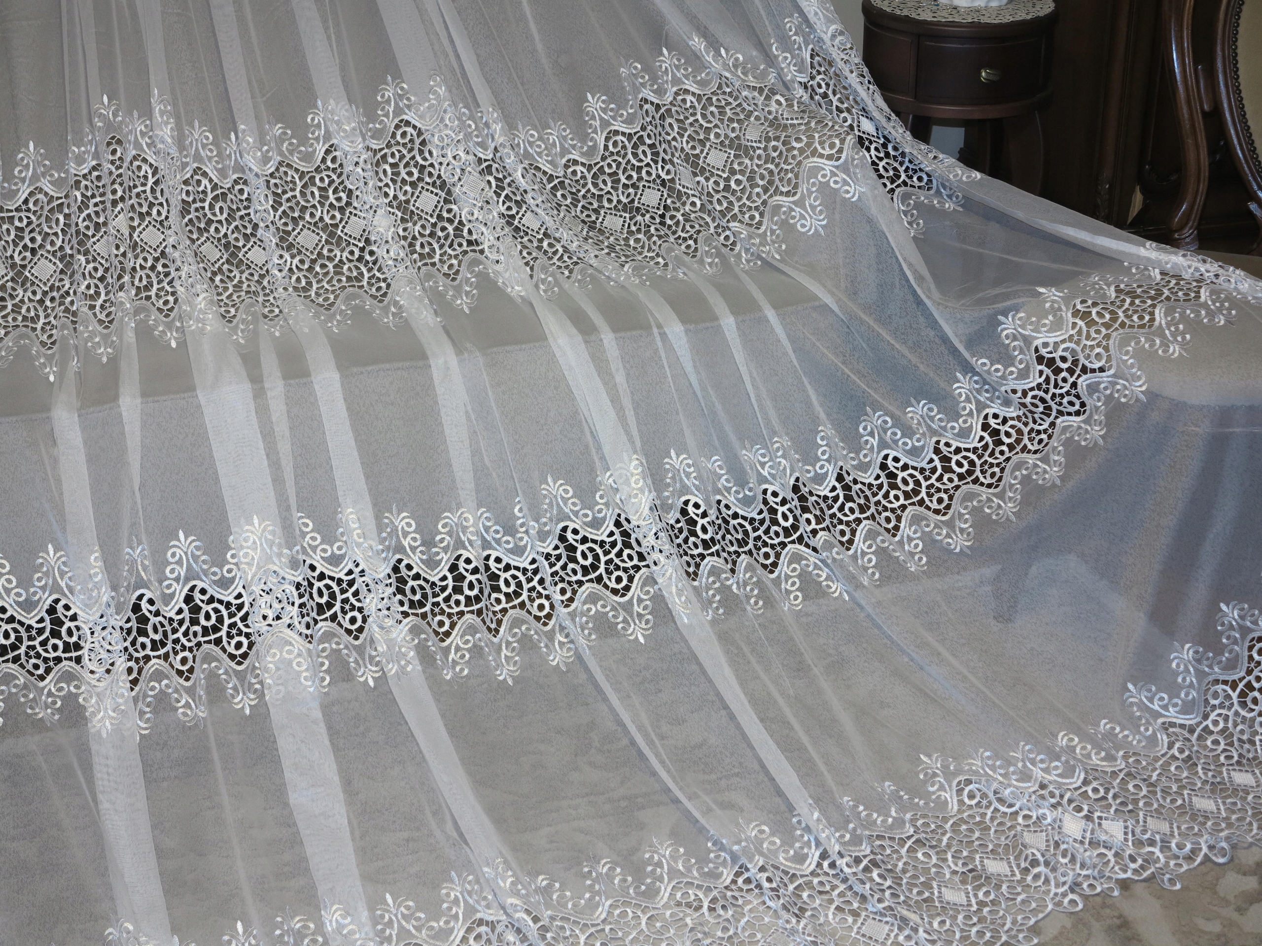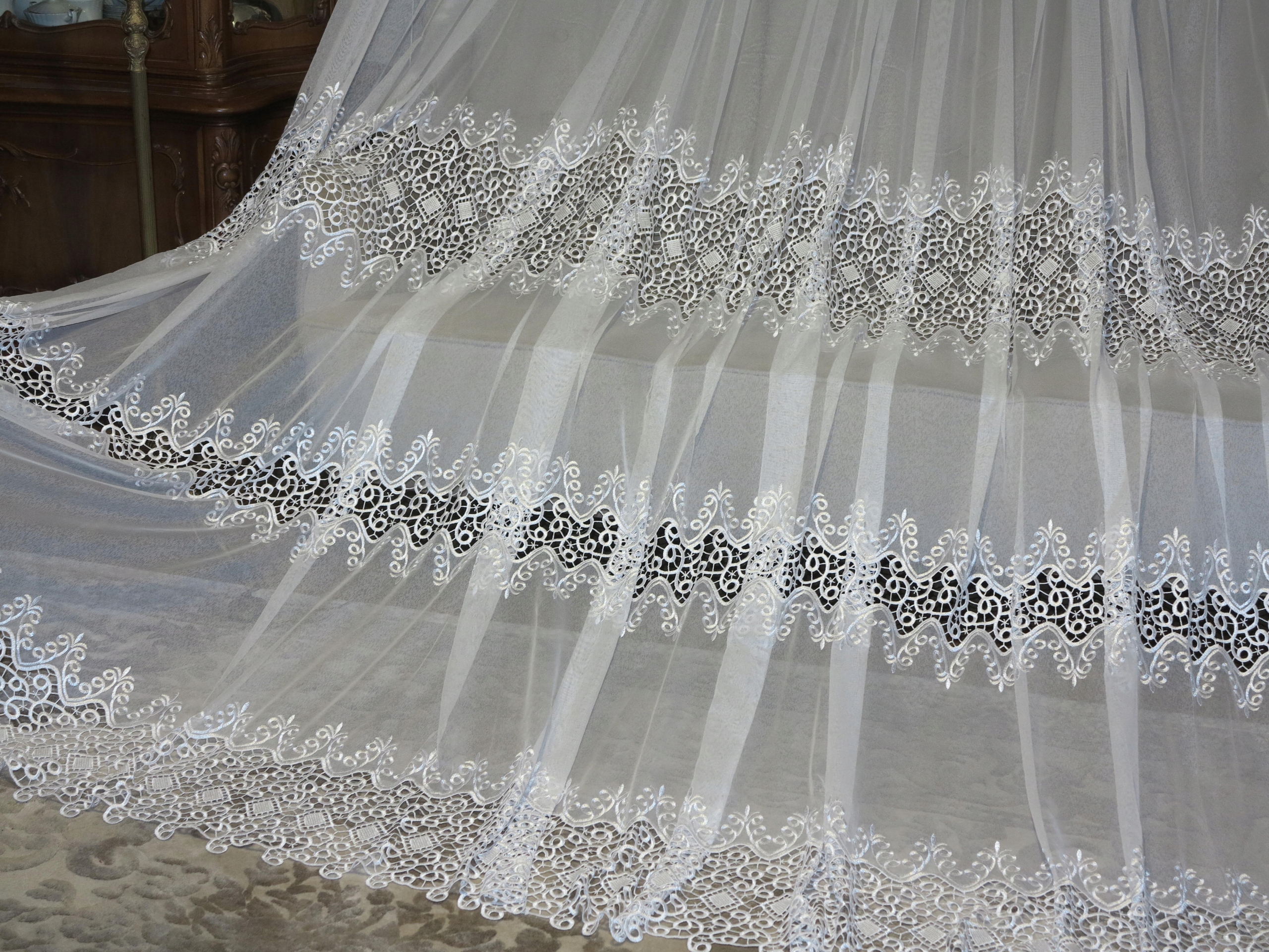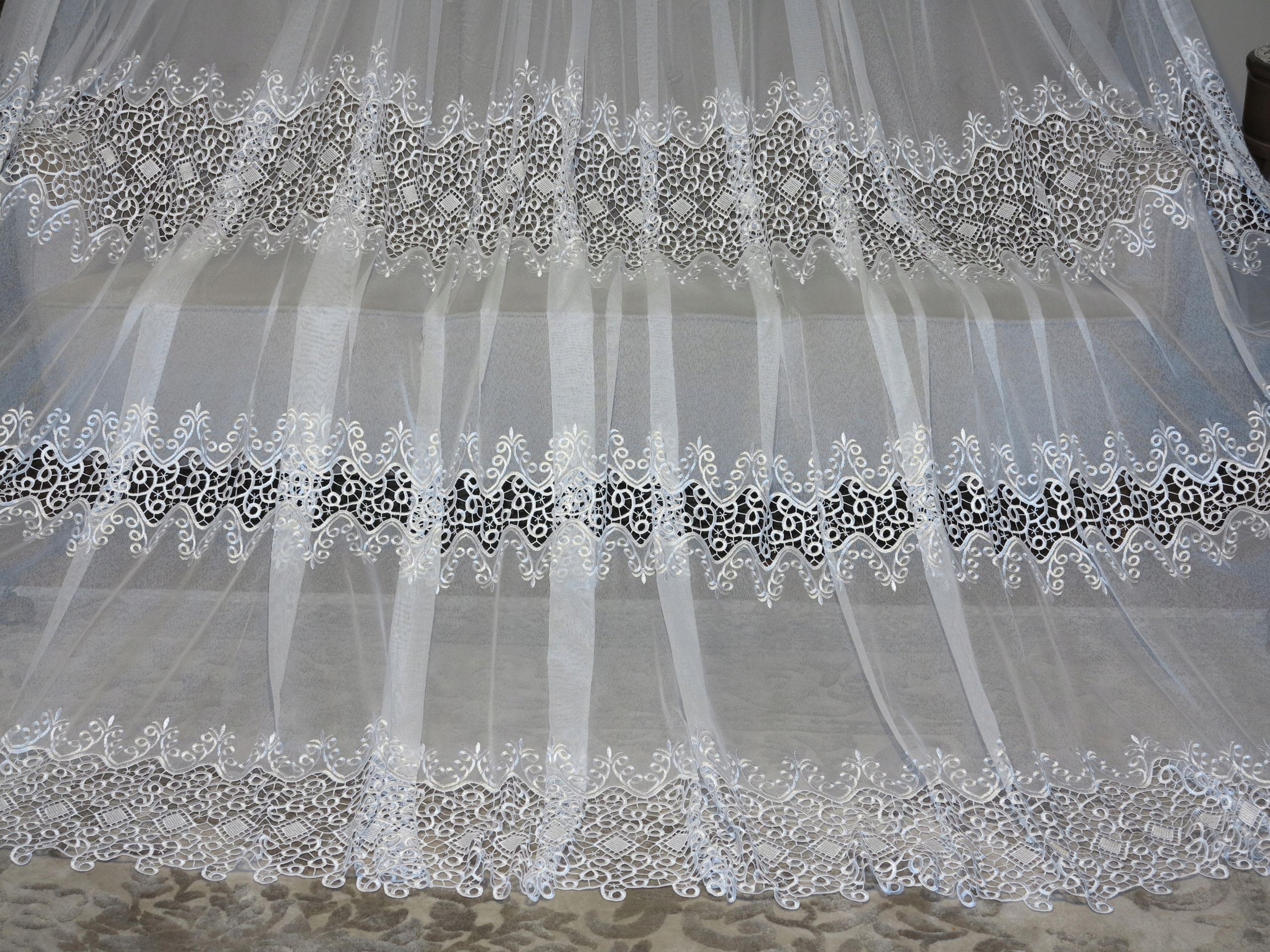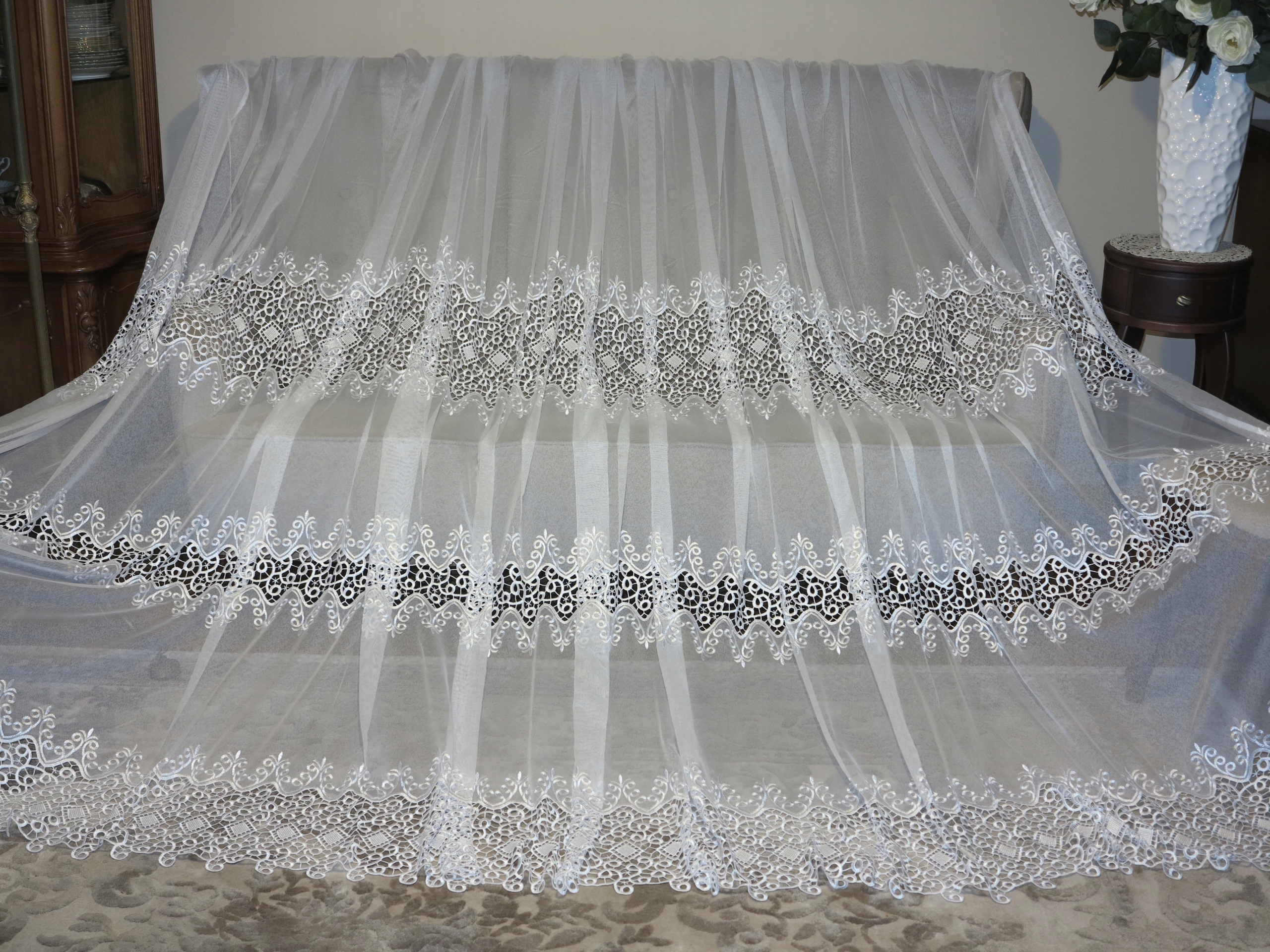 Предметом аукціону є гарна штора з гіпюром в три ряди і вишивкою м'яка, якісна, спадає красиво. Штора б/в, у відмінному стані та якості, з недоліками, описаними вище.
