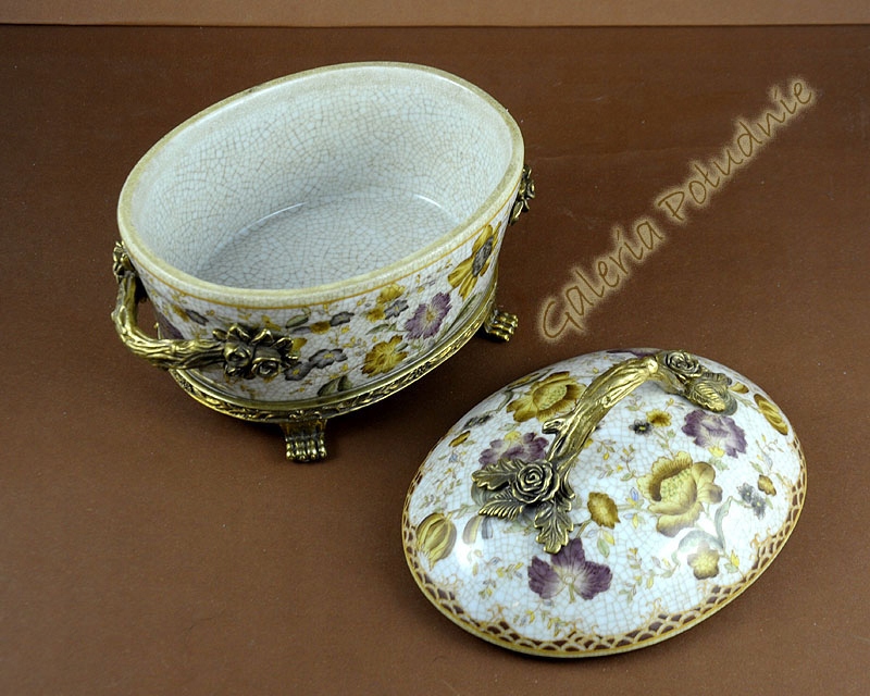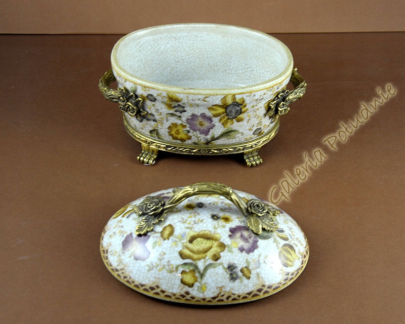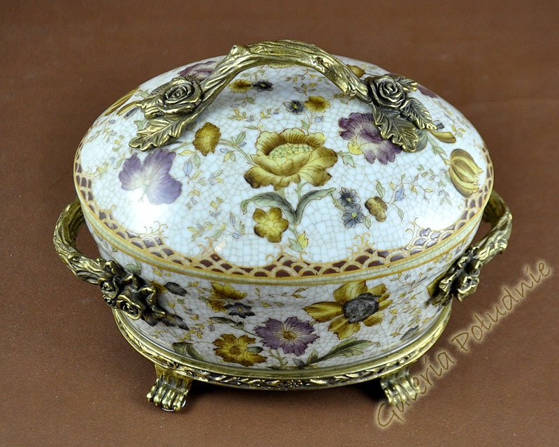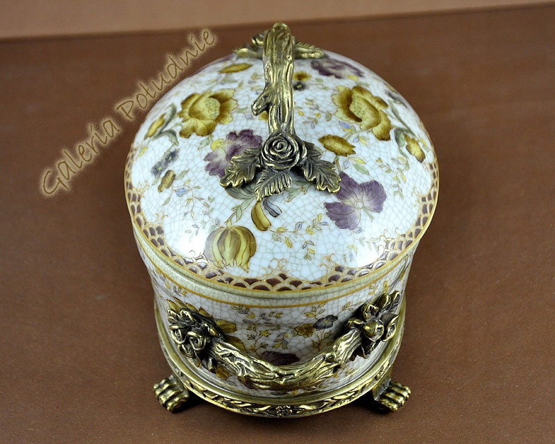 Красива порцелянова скринька кольору слонової кістки, прикрашена мотивами жовтих і бузкових квітів. Вся коробка вкрита ніжним сітчастим малюнком, виглядає так, ніби вона зроблена з мільйона крихітних частинок. Все це доповнюється багатими золото-мідними ручками з трояндами та ніжками-кігтиками, які забезпечують стабільну основу для коробки. Ідеально підходить для витонченого подарунка для жінки, він може вмістити багато дрібничок.