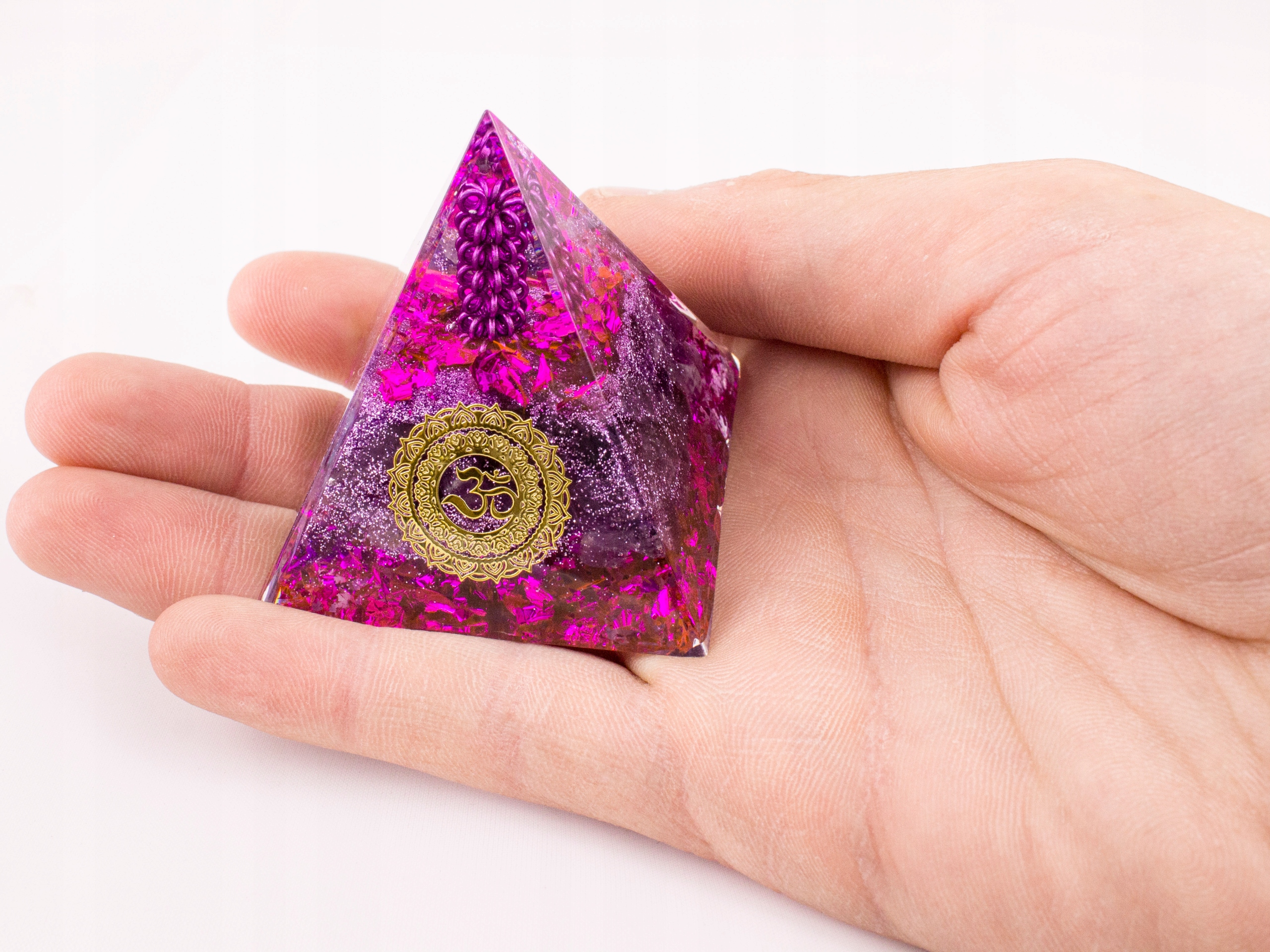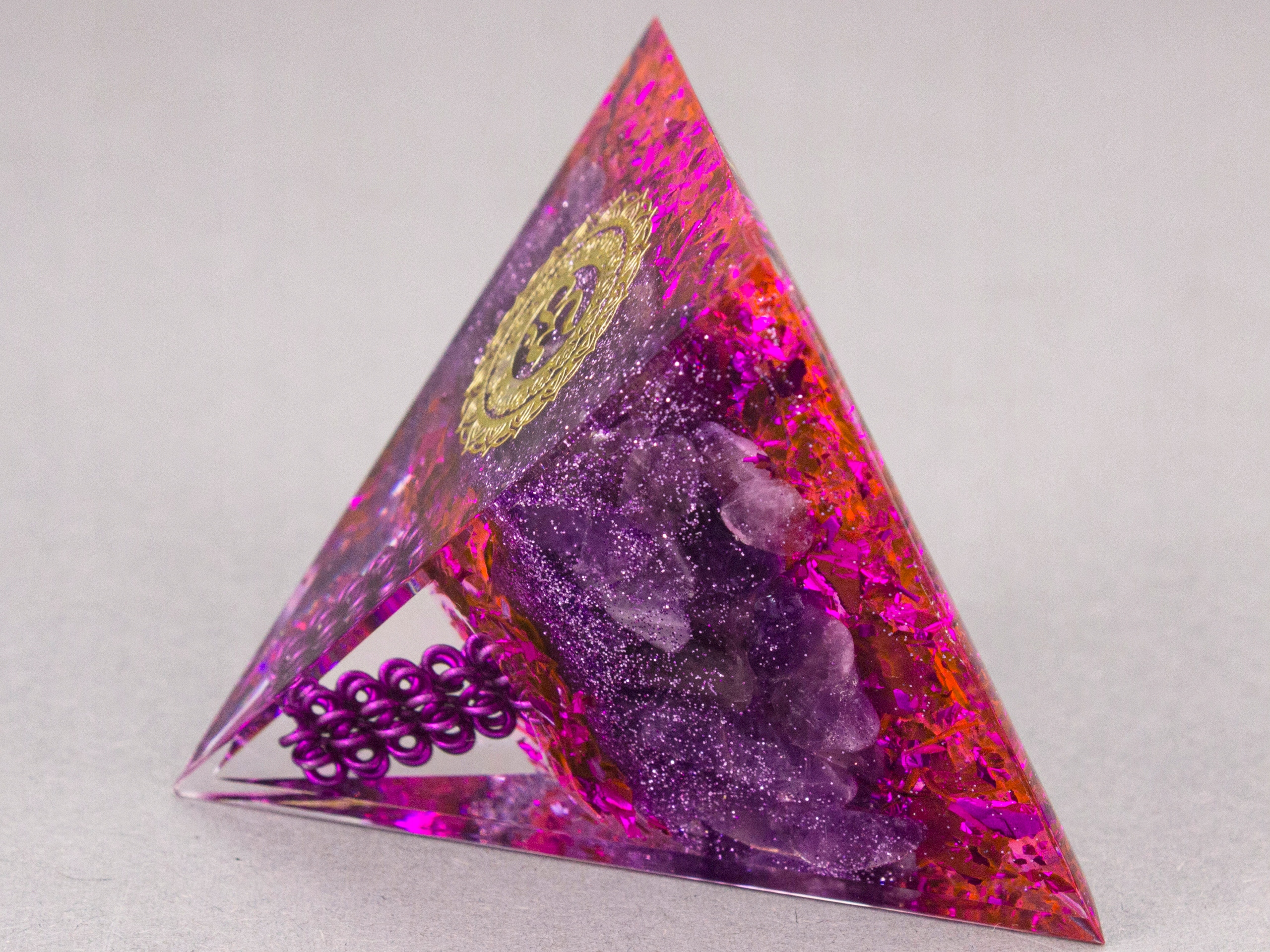 Красива інтенсивно фіолетова оргонітова піраміда з аметистом, міддю, алюмінієм і золотим символом нескінченності OM.