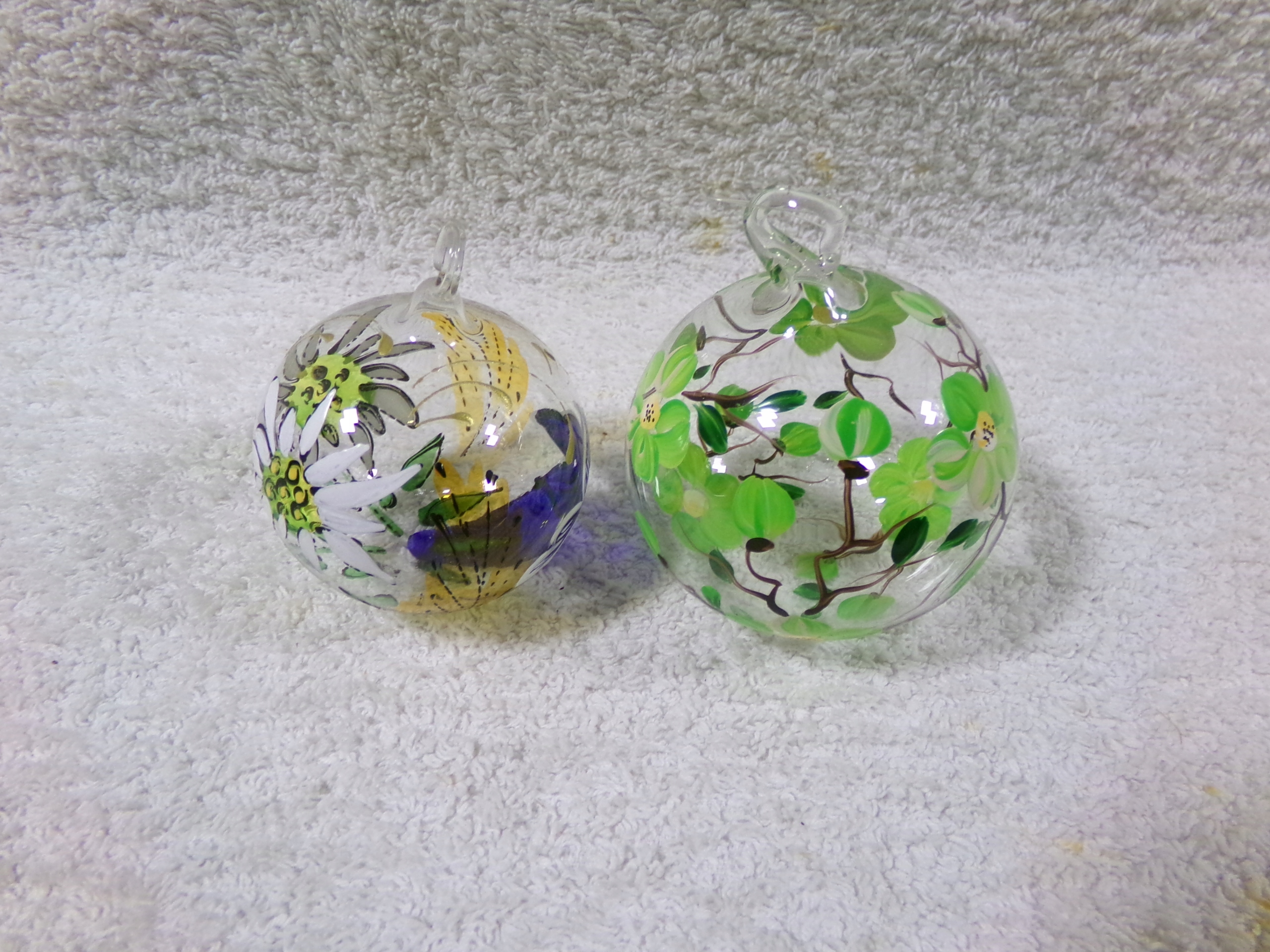 Красиві рукотворні скляні дрібнички з висотою 7,5 та 7 см, діаметром 5 см, вагою 26 грам. Дуже хороший стан збережений, без порожнин.