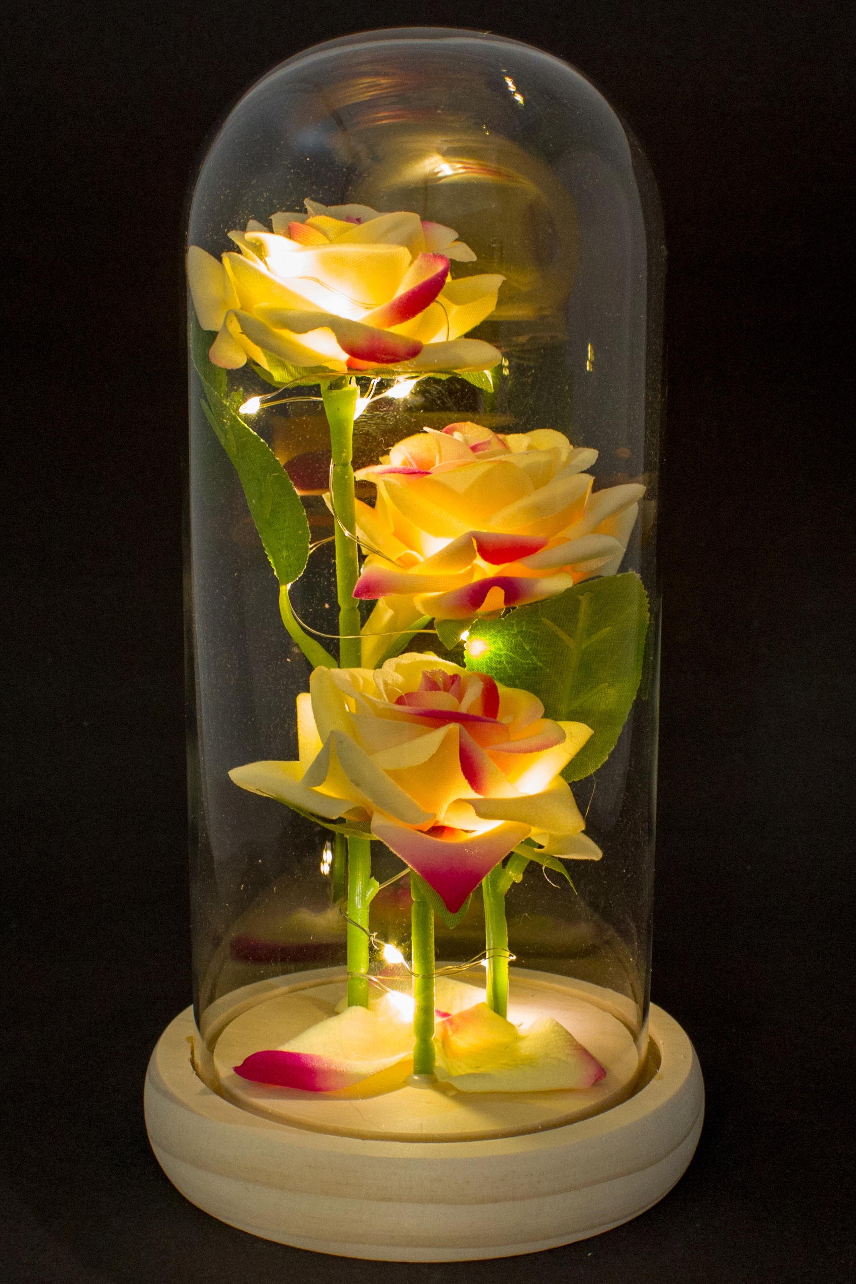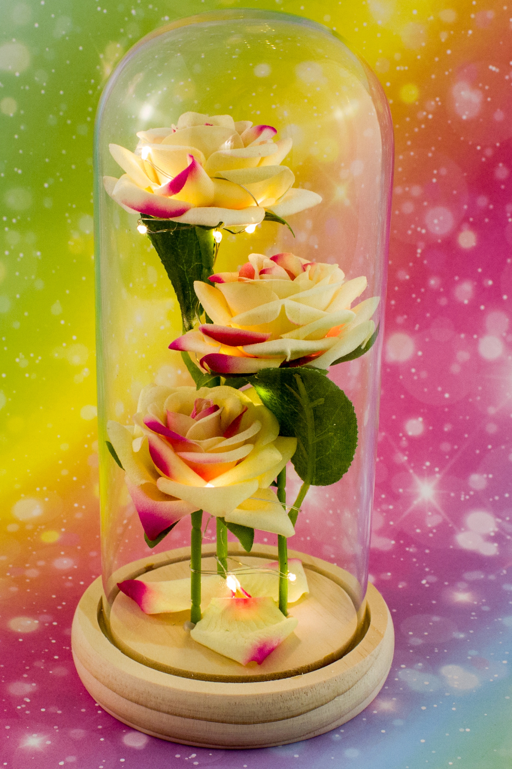 Шалено романтична та елегантна кремово-рожева потрійна штучна троянда у скляному куполі з теплим білим світлодіодним підсвічуванням виглядає як справжня.