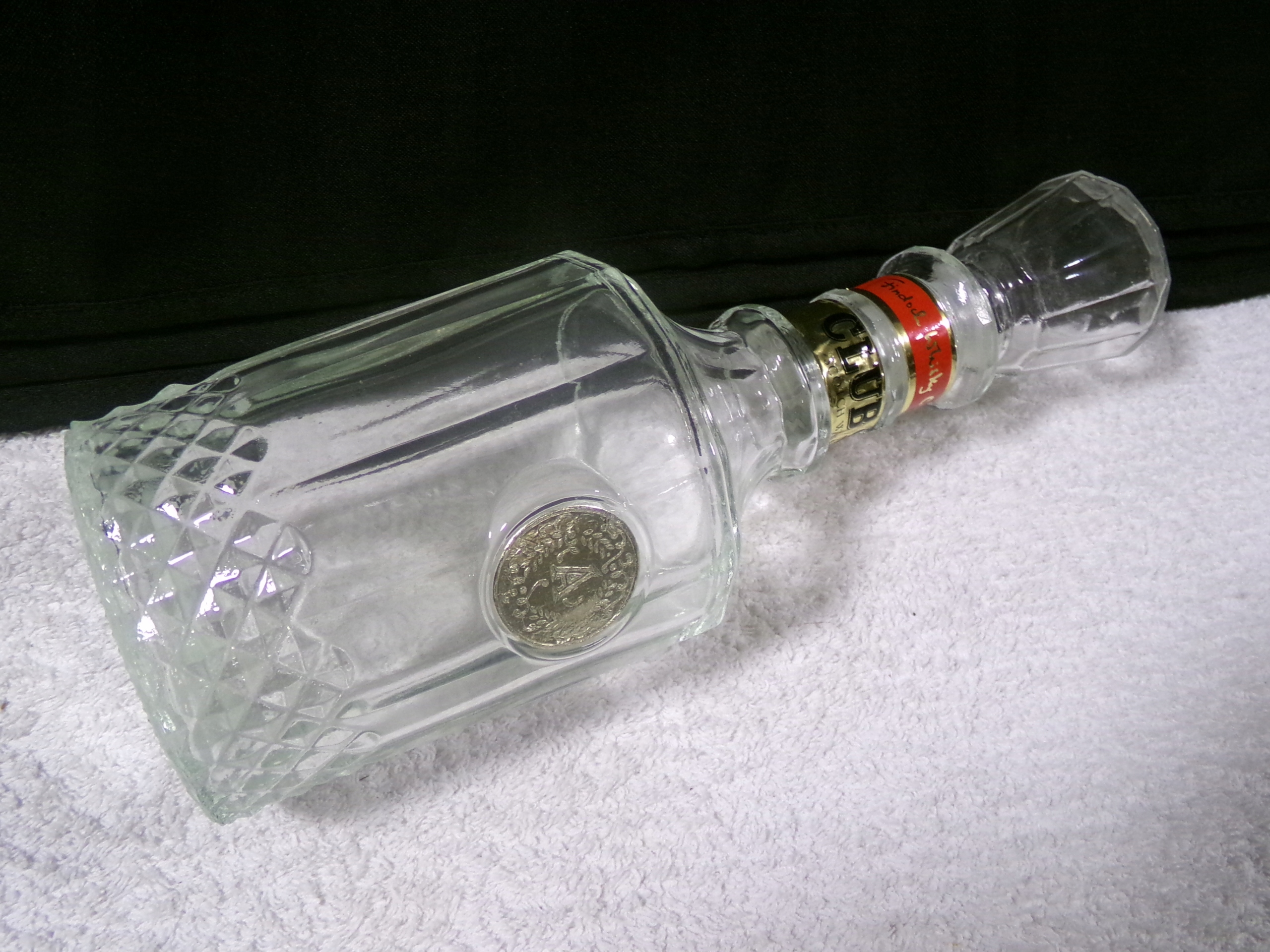 Красивий скляний караф з висотою 26,5 см, діаметром 8,5 см, ємністю 0,7 літрів, вагою 0,79 кг. Дуже хороший стан збережений, без порожнин.