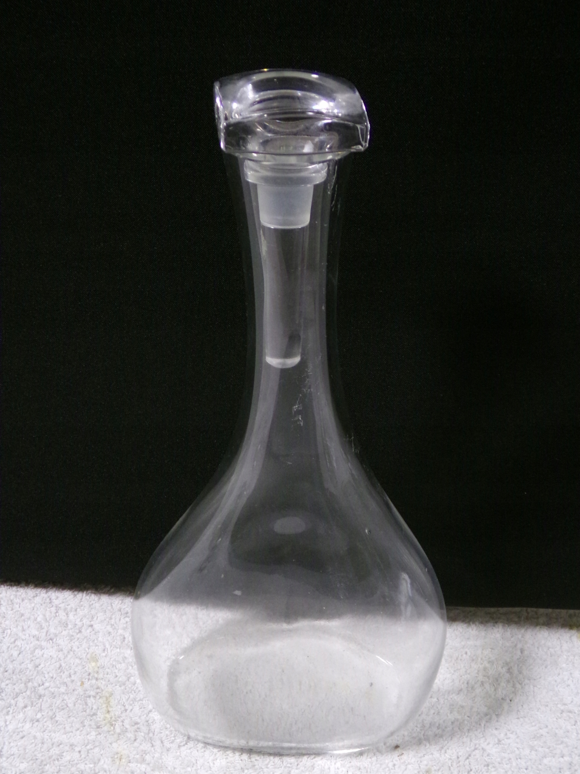 Красивий скляний караф з висотою 32 см, діаметр 15 см, ємність 1 літр, вагою 1,15 кг. Умова дуже хороша, без пошкоджень, пробка не з цього карафа.