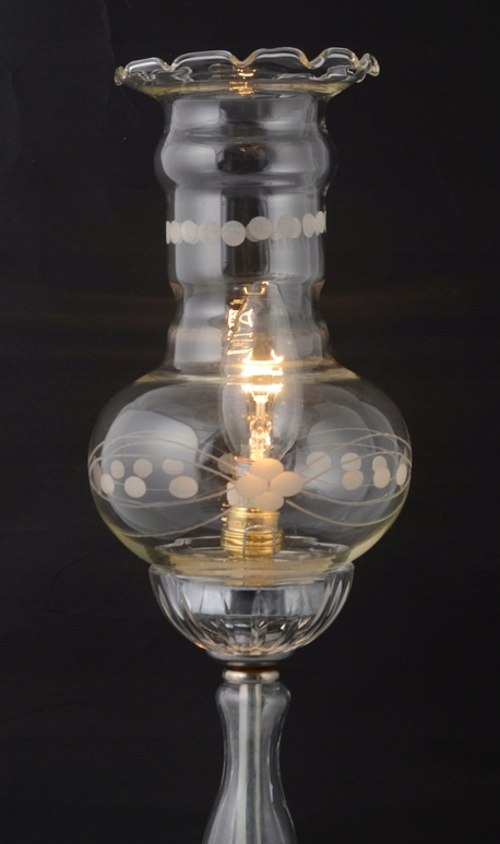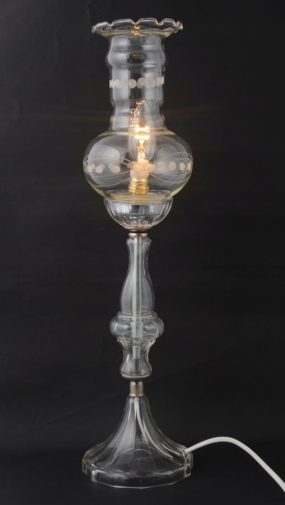 Ця унікальна лампа була виготовлена в Іспанії в 1960-х роках. Оправа світильника являє собою поєднання сріблястого металу і скляних декоративних елементів. Світильник має красивий абажур з воланом, виготовлений з міцного прозорого скла. Широка основа забезпечує стійкість і безпеку речі. Все це виглядає надзвичайно ефектно і ідеально підходить для столу, столу, тумбочки або просто як прикраса будь-якої кімнати.Лампа після ремонту, нова електрика.