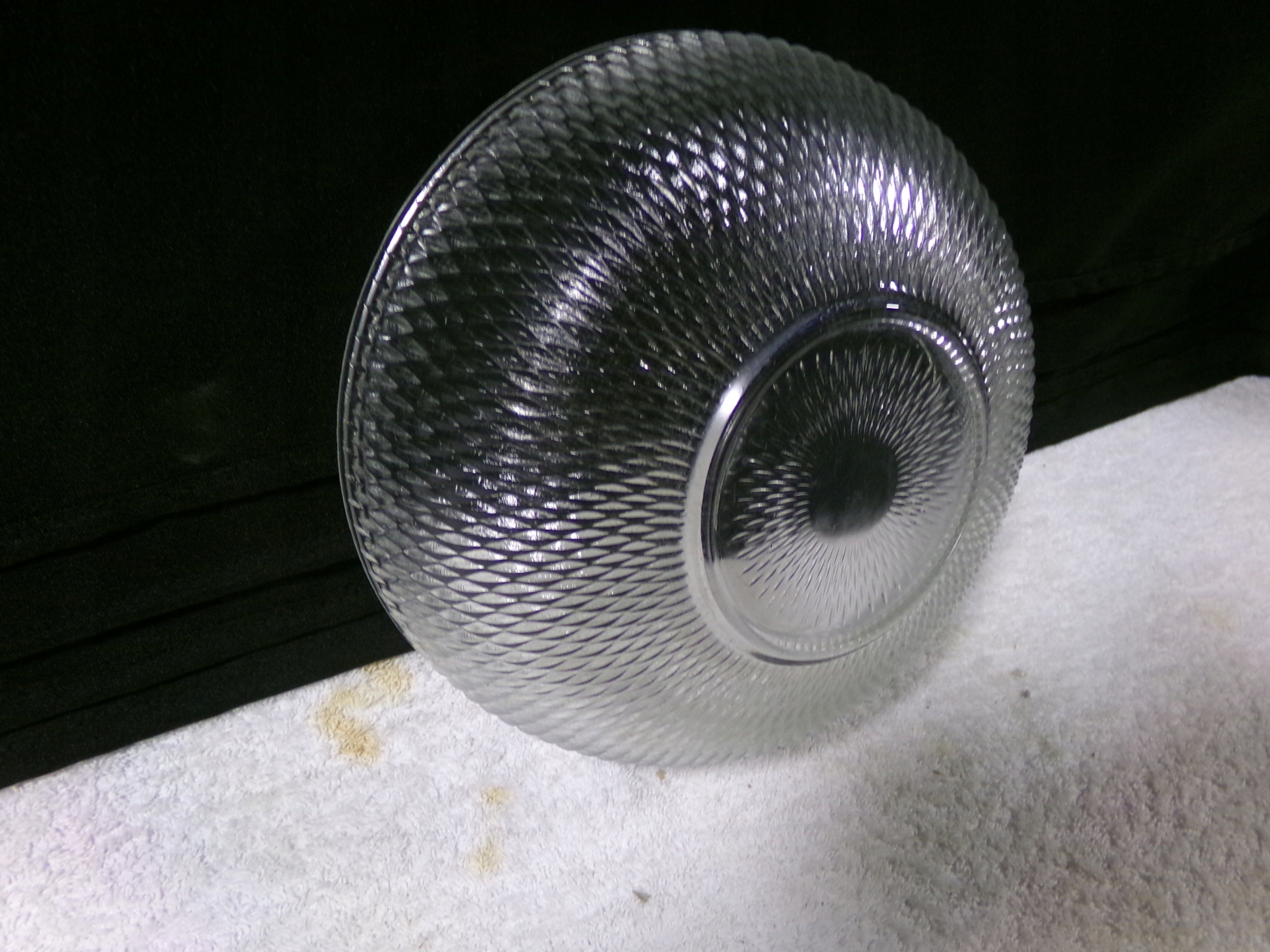 Красива скляна миска заввишки 7 см, середній діаметр 20,5 см, вагою 0,73 кг. Дуже хороший стан збережений, без порожнин.