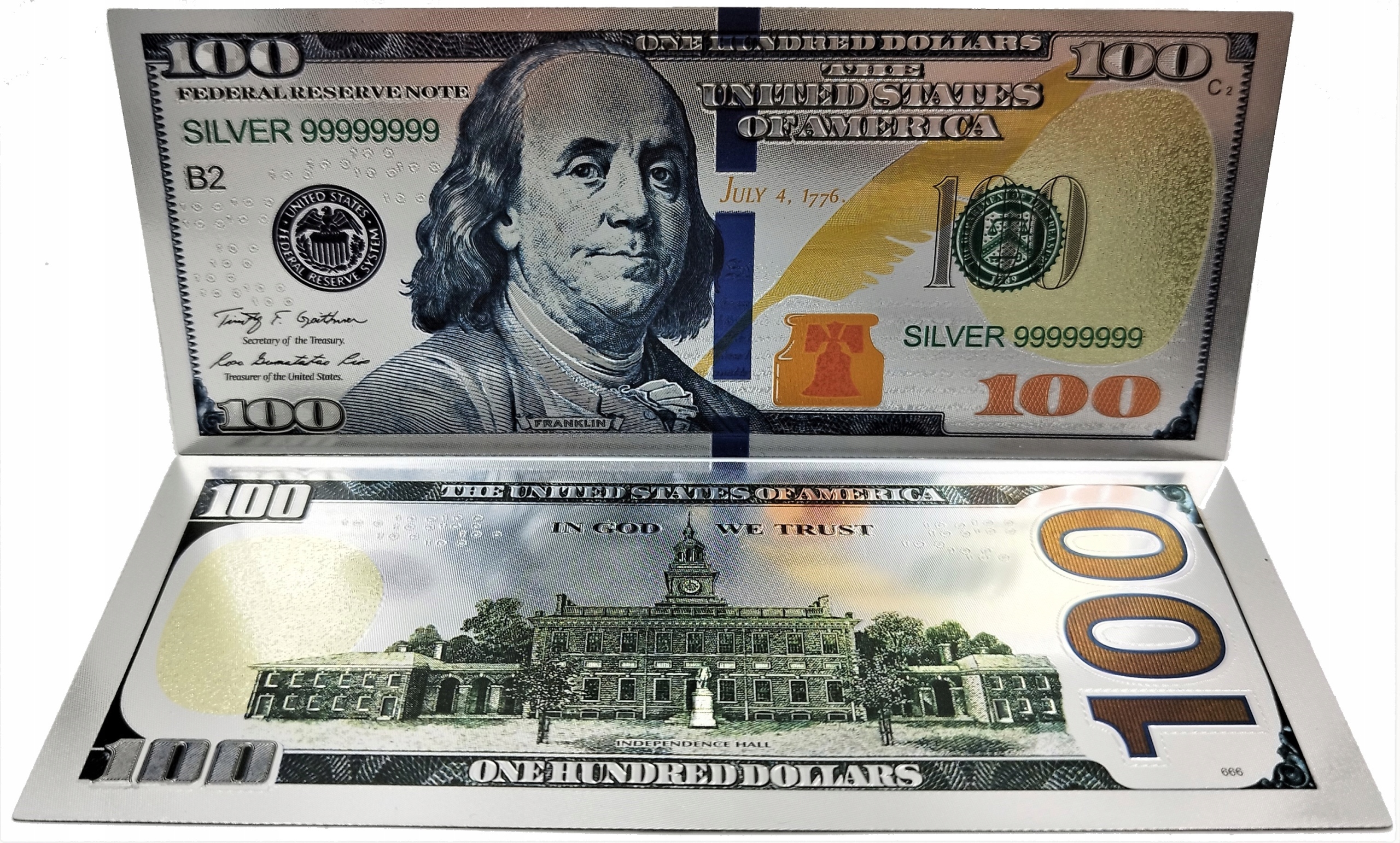 КОЛЕКЦІЙНА БАНКНОТА 100 ДОЛАРІВ США, СРІБНА ВЕРСІЯ