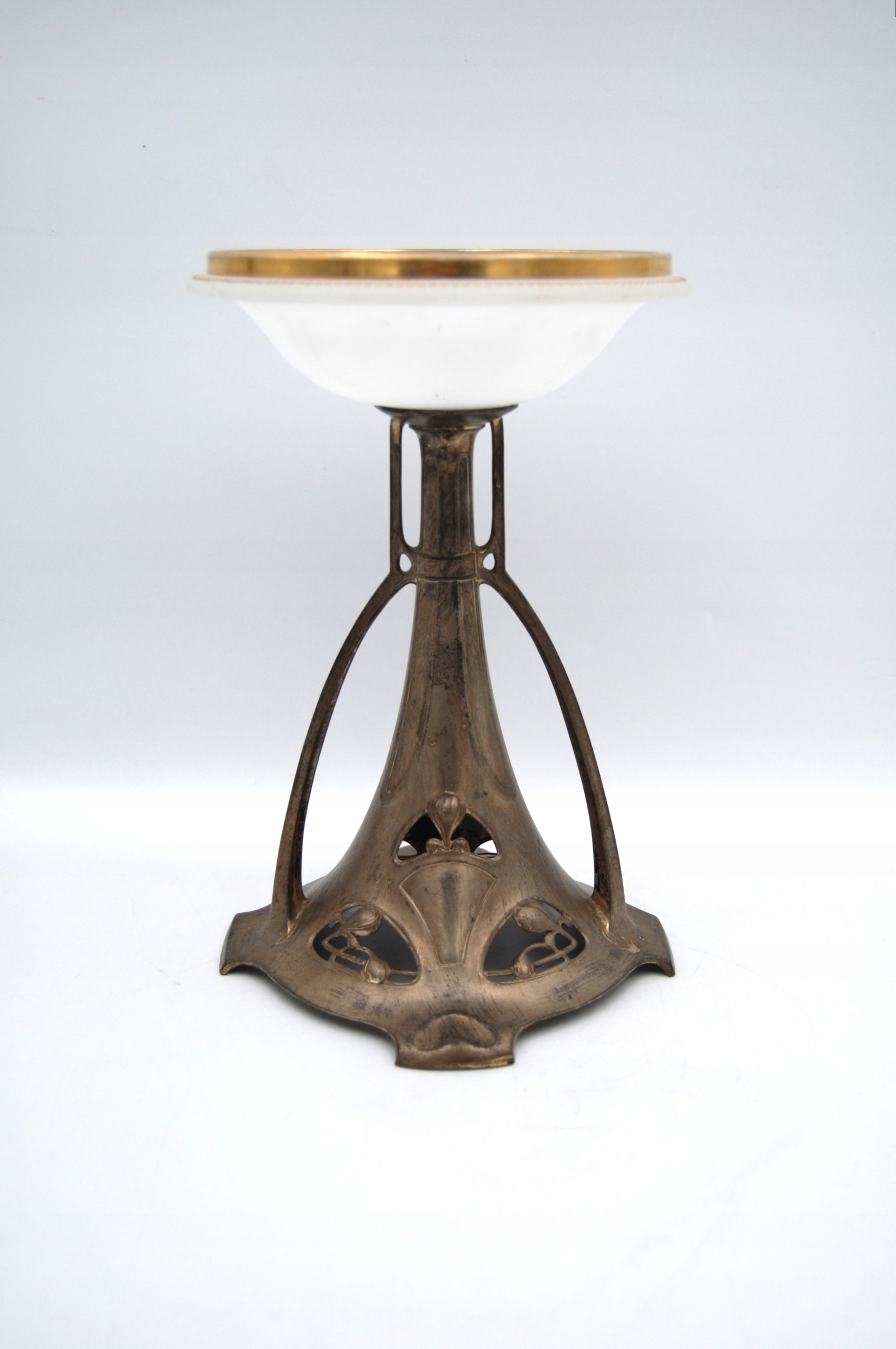 Красиво декорована основа на чотирьох ніжках з додатковими боковими опорами. Скло біле, зовні матове з позолоченою кромкою.