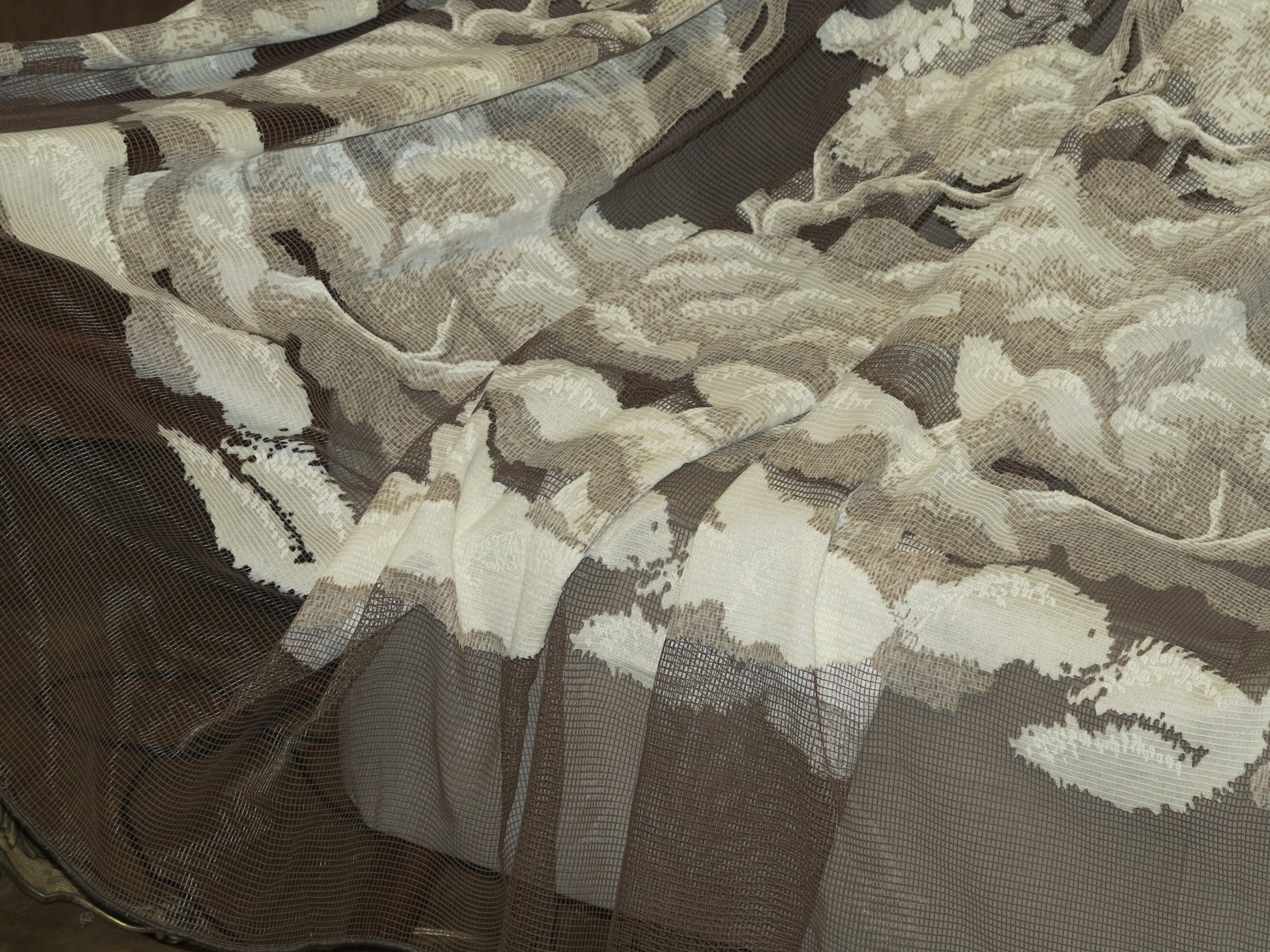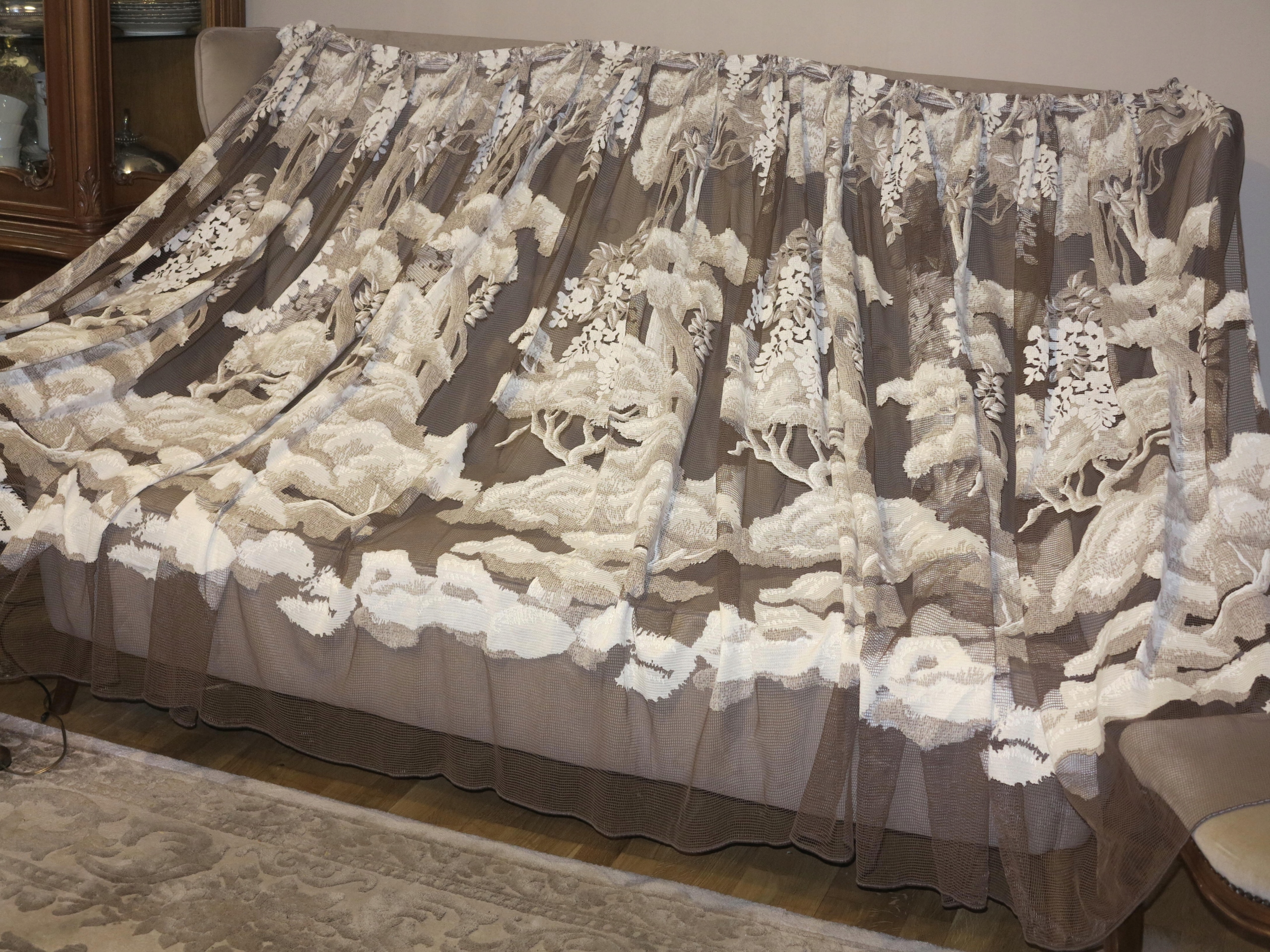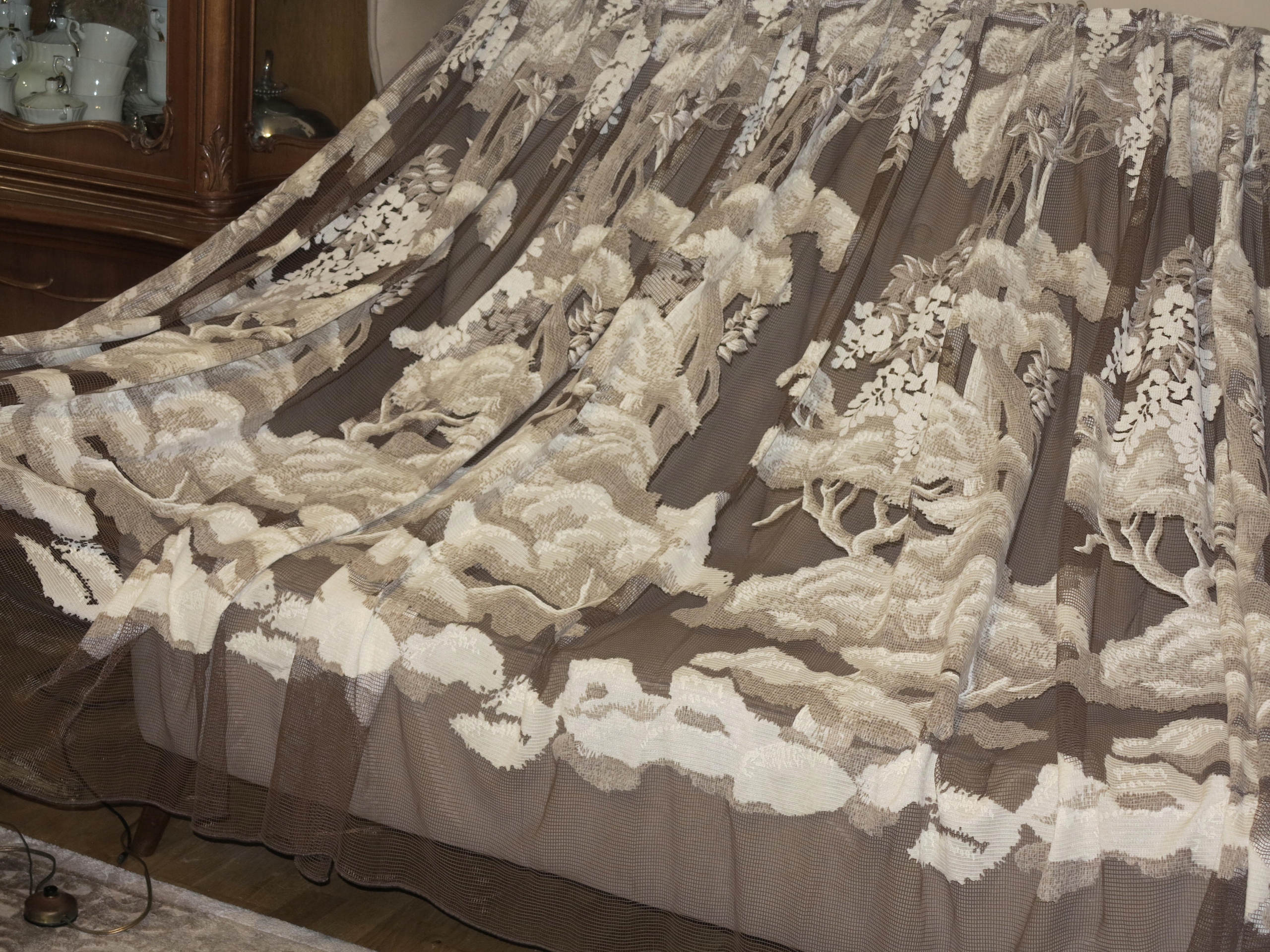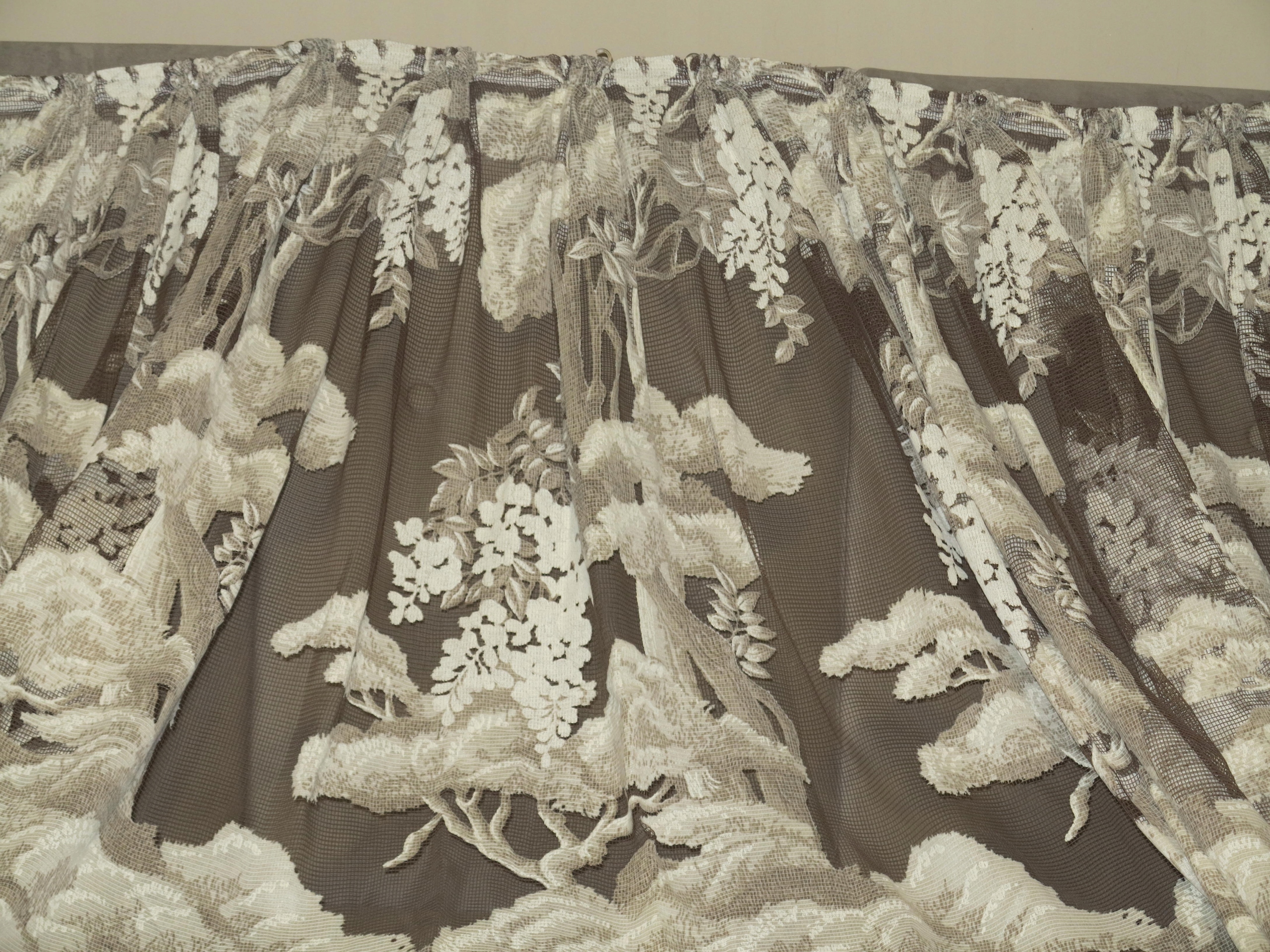 ГАРНУ, СТАРОВУ ШТОРУ - ШТОРУ В РАМЦІ КВІТУЧИХ ДЕРЕВ. БІЛЬШ ТЕМНО БЕЖЕВОГО ТА КРЕМОВО-БІЛОГО КОЛІРІВ