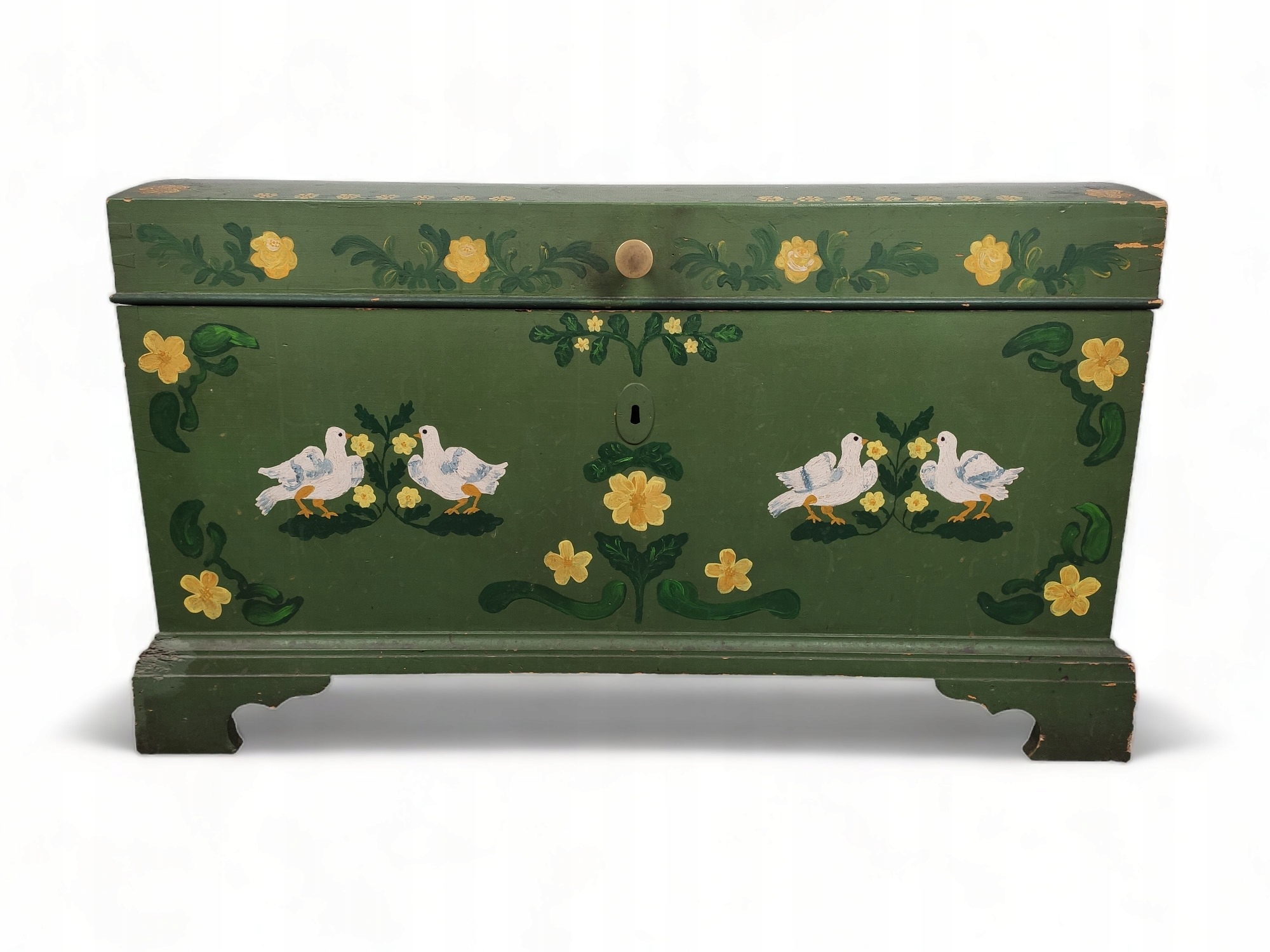 Гарна стара скриня, розписана вручну. Коробка має нормальні сліди використання, місцями легкі відколи, лівий нижній кут поверхнево пошкоджений (на фото). Крім того, без істотних пошкоджень. Коробка стійка і міцно виготовлена. Загальний стан хороший.